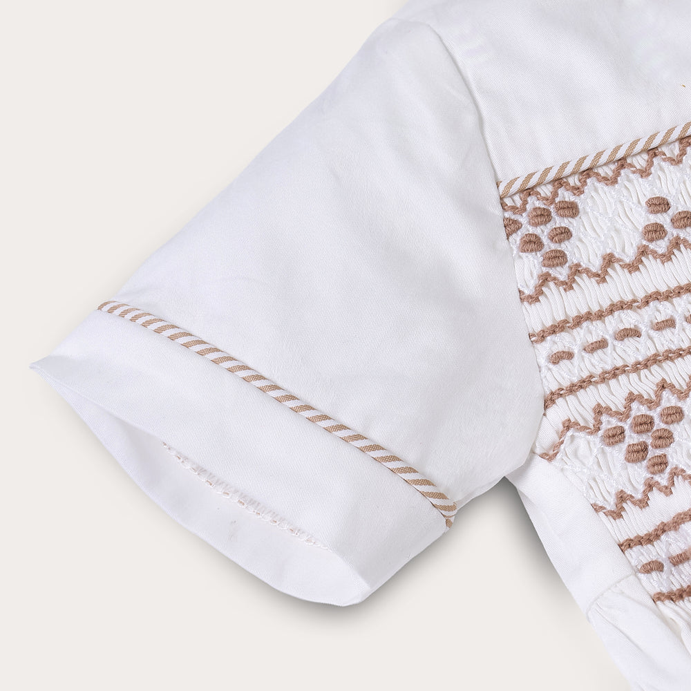 A charming sibling match to our beloved Blake Dress, the Blake Romper Set combines timeless style with comfort. The romper features intricate hand smocking across the chest, a crisp white Peter Pan collar, and coordinating striped bloomer-style shorts for a classic finish.