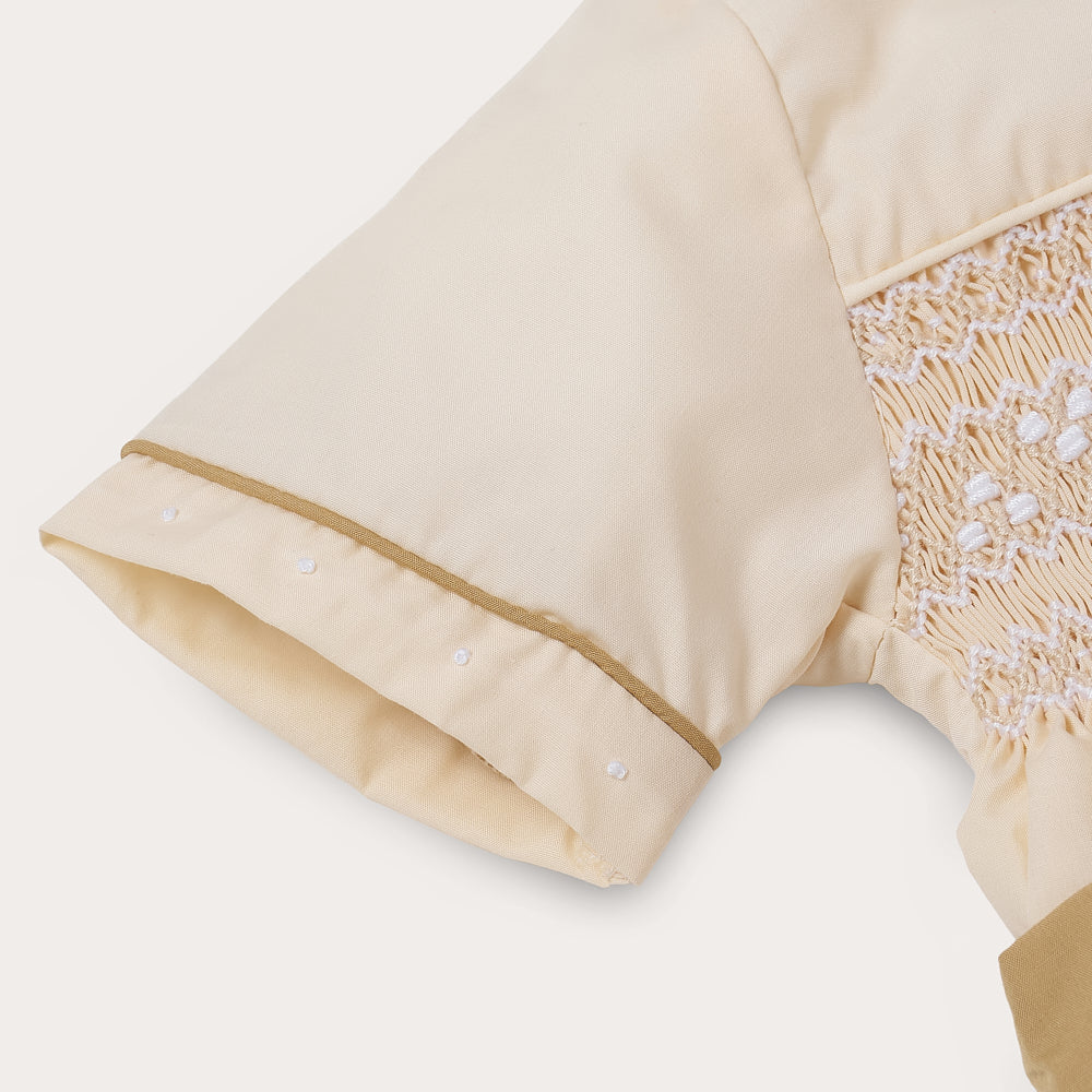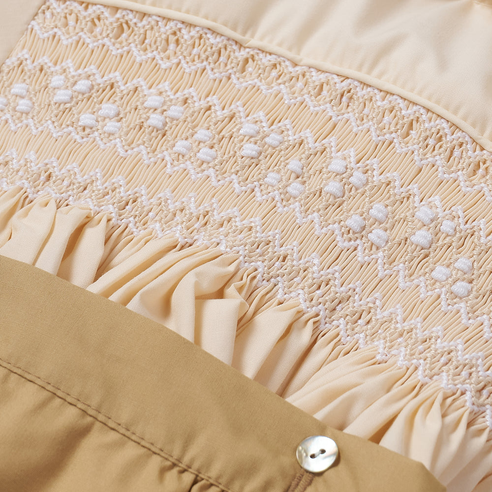 Expertly hand-smocked across the chest, this timeless design features delicate white embroidery on a soft buttercream base, complemented by contrasting toffee-coloured shorts. The smart Peter Pan collar and piped sleeve trims complete the classic look. The perfect match for our toffee Talia dress and romper.