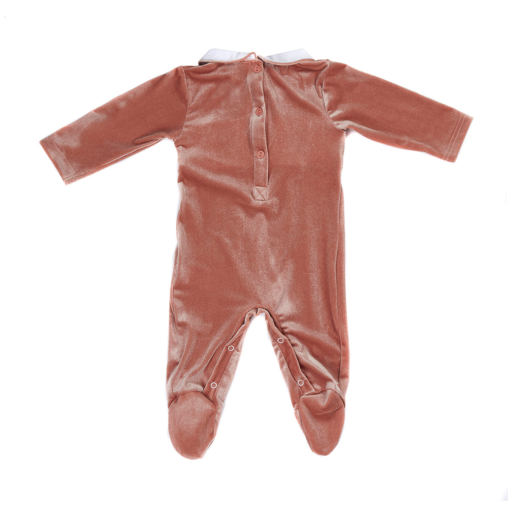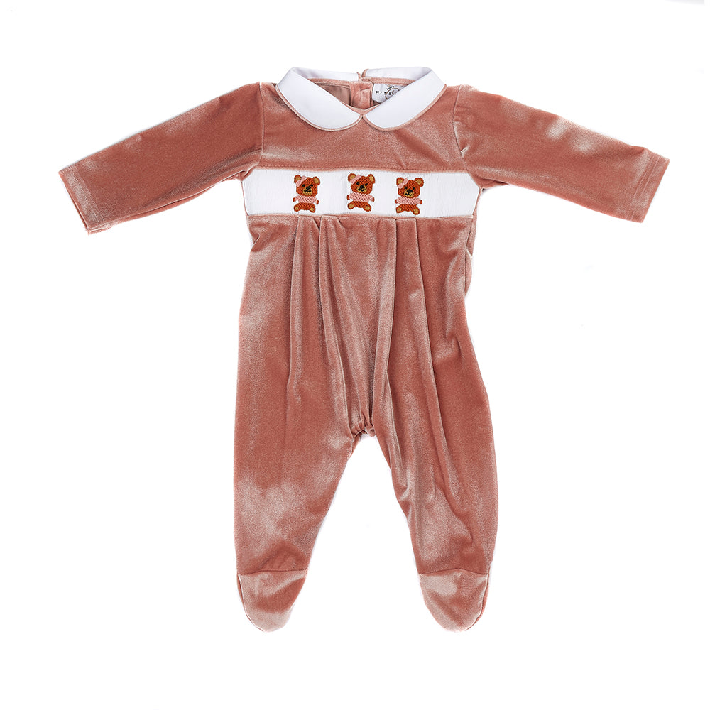 Littlemissc velour baby grow. Intricate hand smocked teddy design. White cotton collar with piped edging. Button through legs.