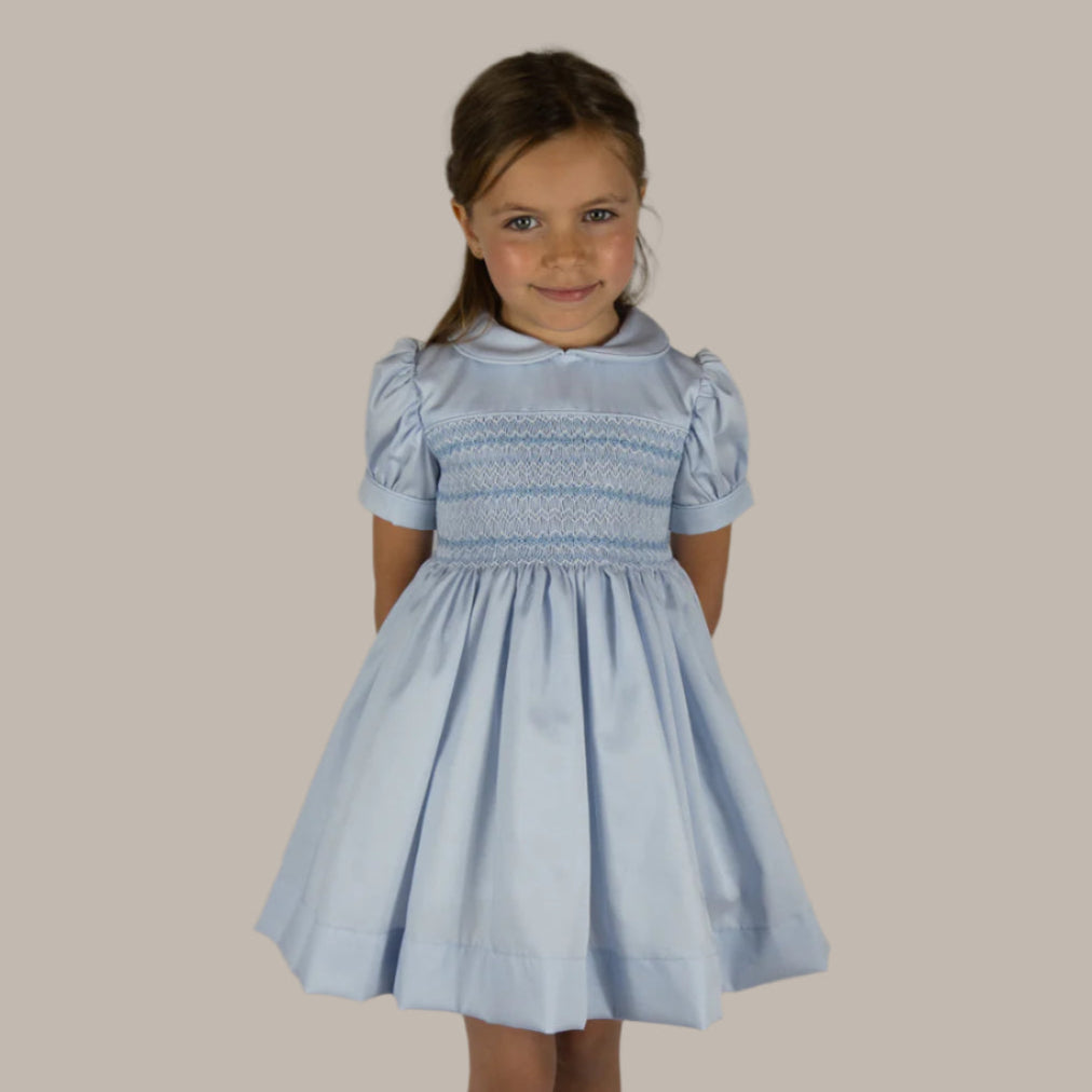 A timeless classic with a modern heirloom touch, the Alice Dress in powder blue is a beautiful blend of charm and craftsmanship. Hand-smocked front and back with intricate embroidery across the chest and framed by soft puff sleeves and a delicate Peter Pan collar, this dress is designed for special moments — birthdays, garden parties, and keepsake photos alike.