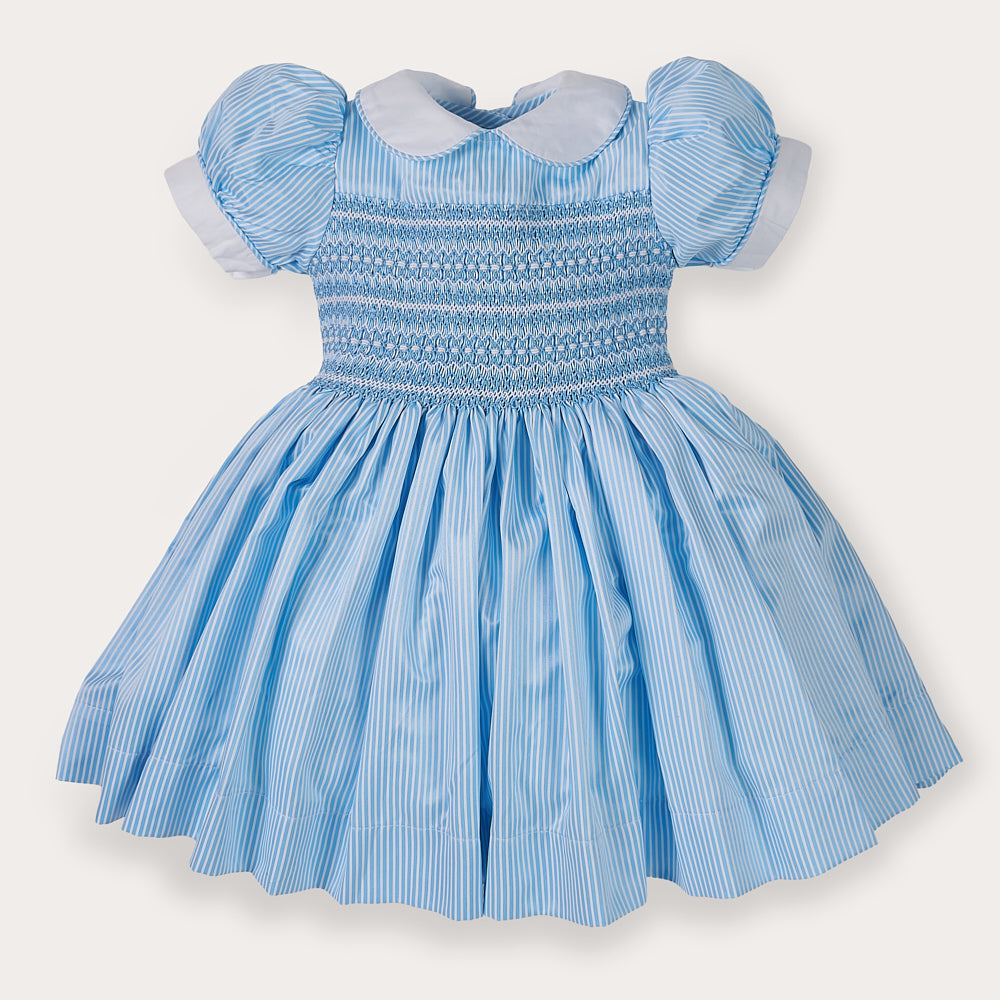 Presenting our beautiful hand smocked Betty dress in blue and white striped satin cotton.