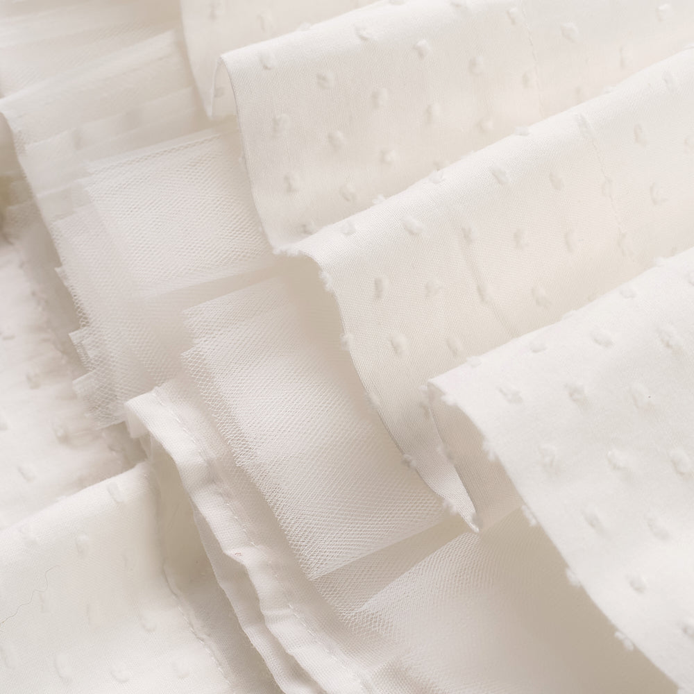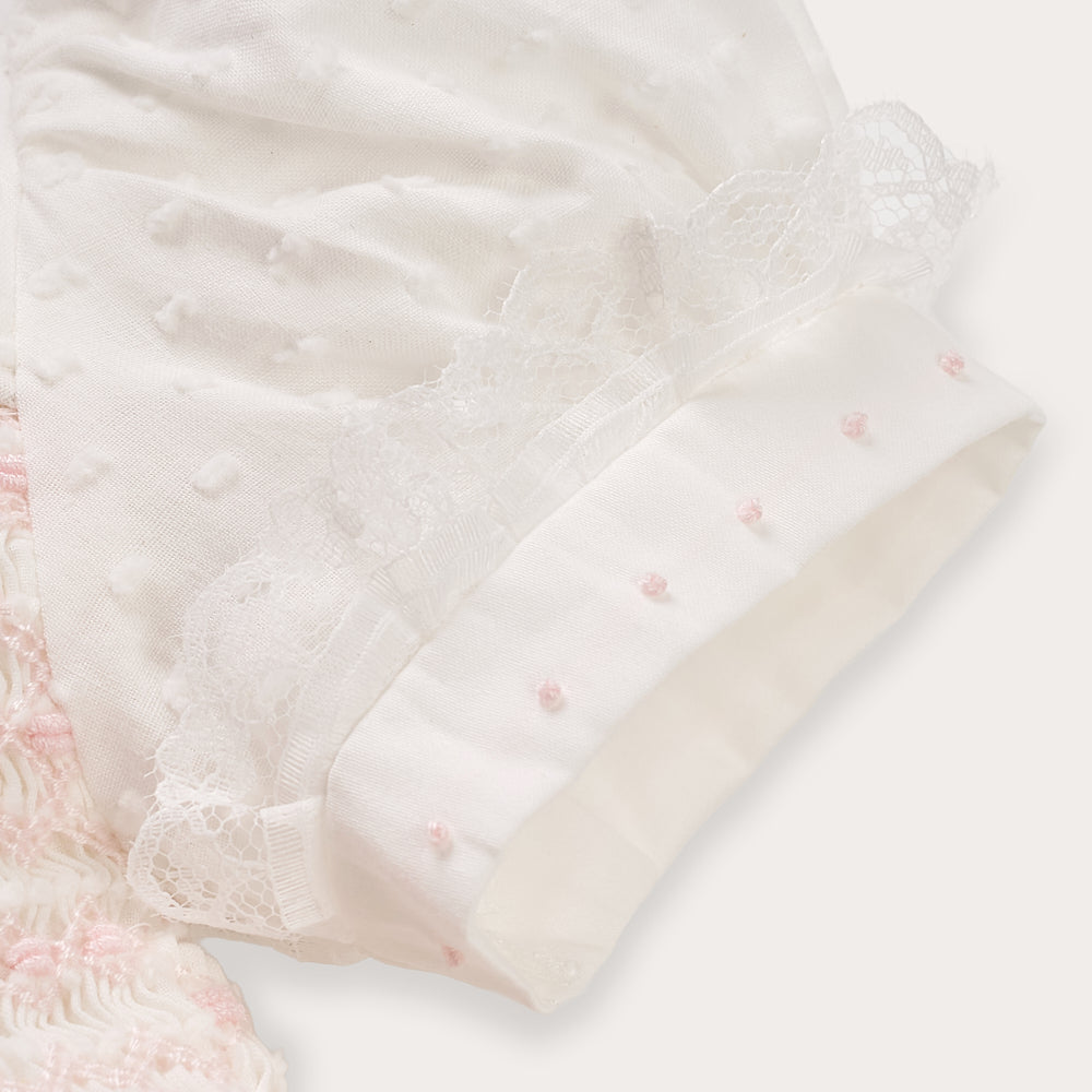 Crisp white Swiss dot cotton. Intricate front and back smocking plate in a soft shade of pink. Embroidery and delicate lace along the colour and cuffs. In a Full circle skirt with added tutu netting under skirt giving maximum volume.