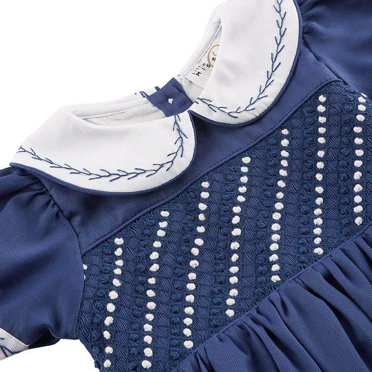 Intricate full smocking plate in shades of navy and white to compliment this stunning fabric. Navy piping along the collar and cuffs.