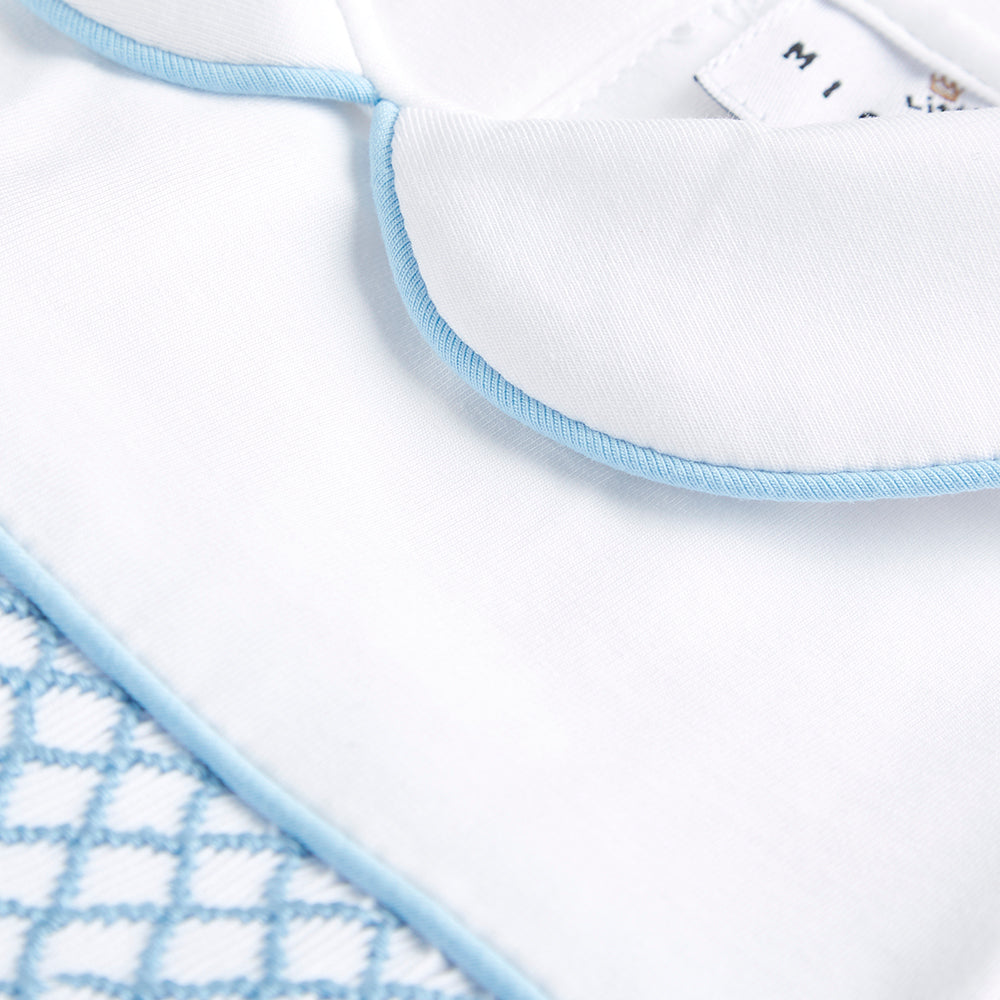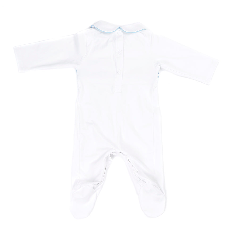 Littlemissc white pure soft cotton baby grow. Intricate hand smocked design in blue. White cotton collar with piped edging. Button through legs.