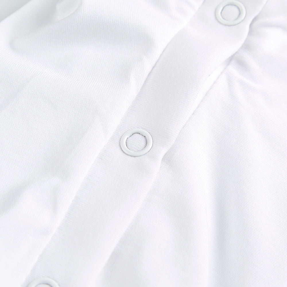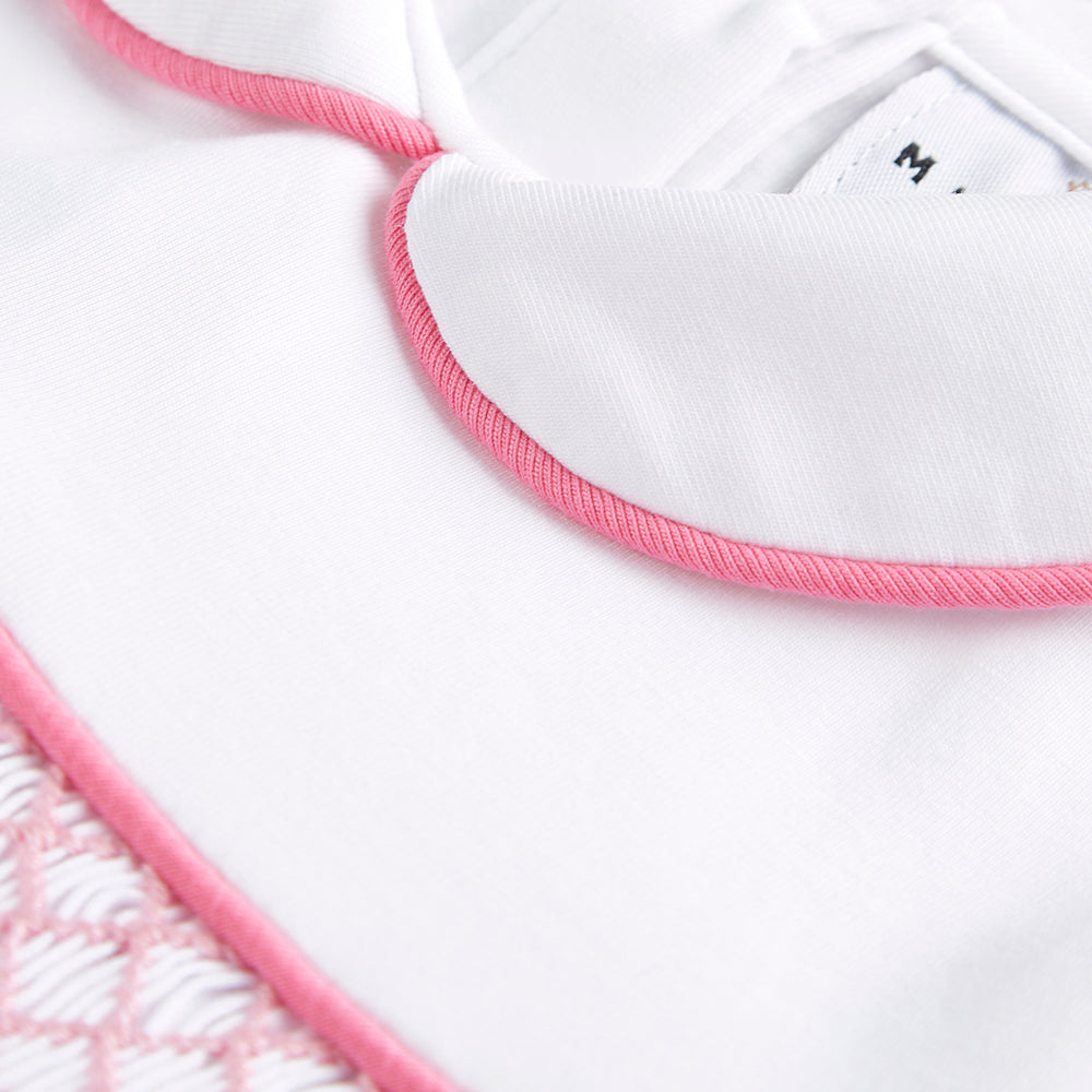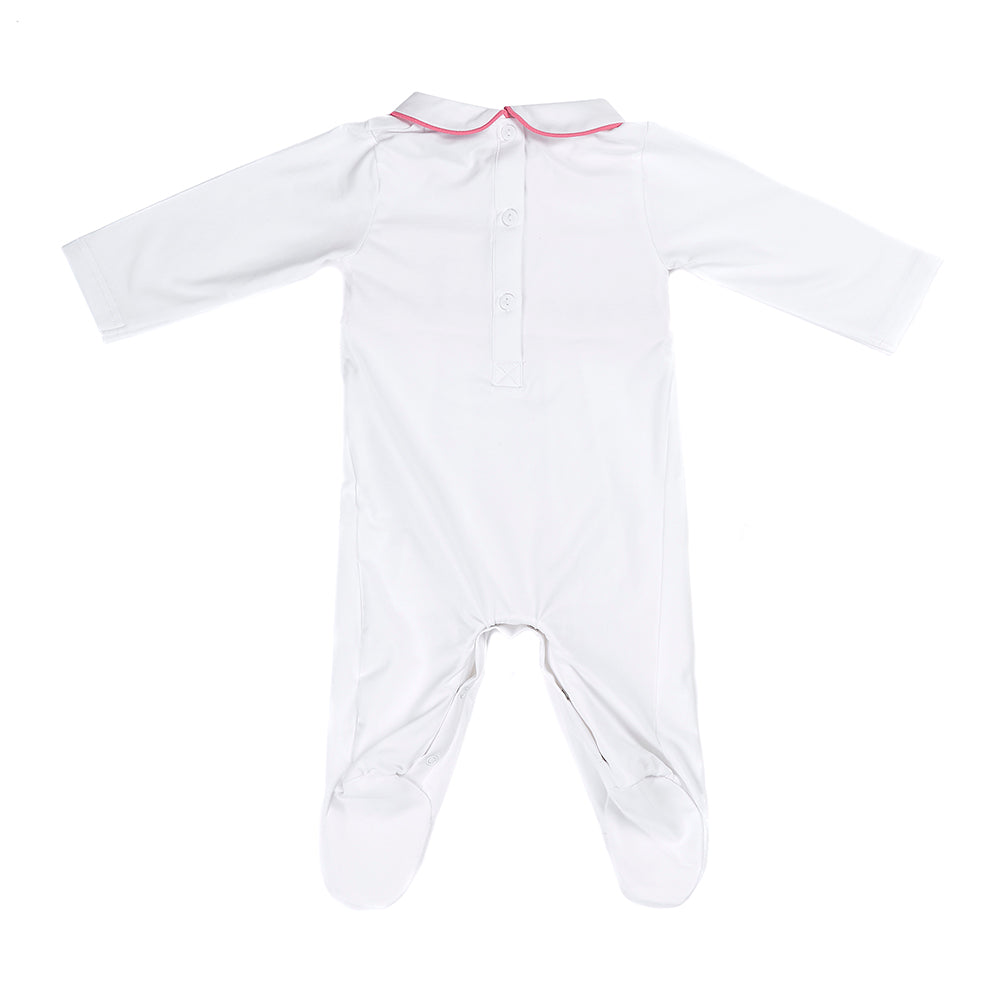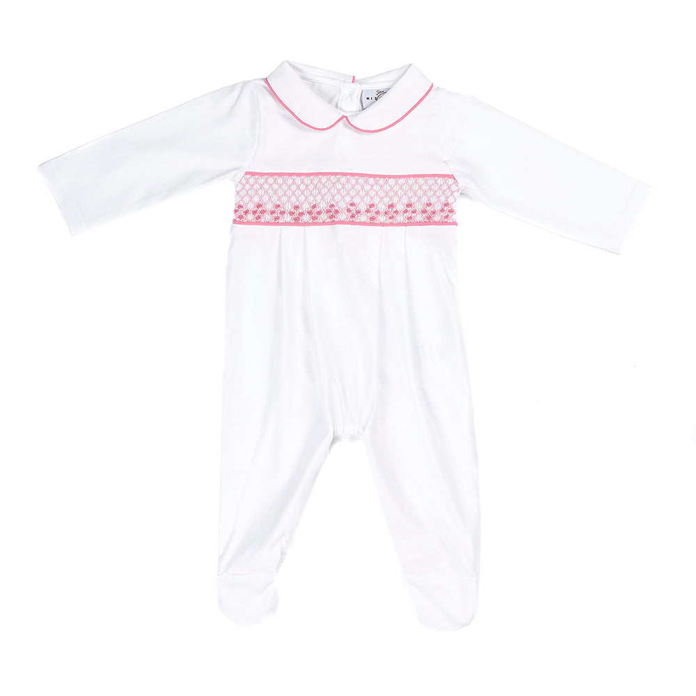 Littlemissc white pure soft cotton baby grow. Intricate hand smocked design in pink. White cotton collar with piped edging. Button through legs.