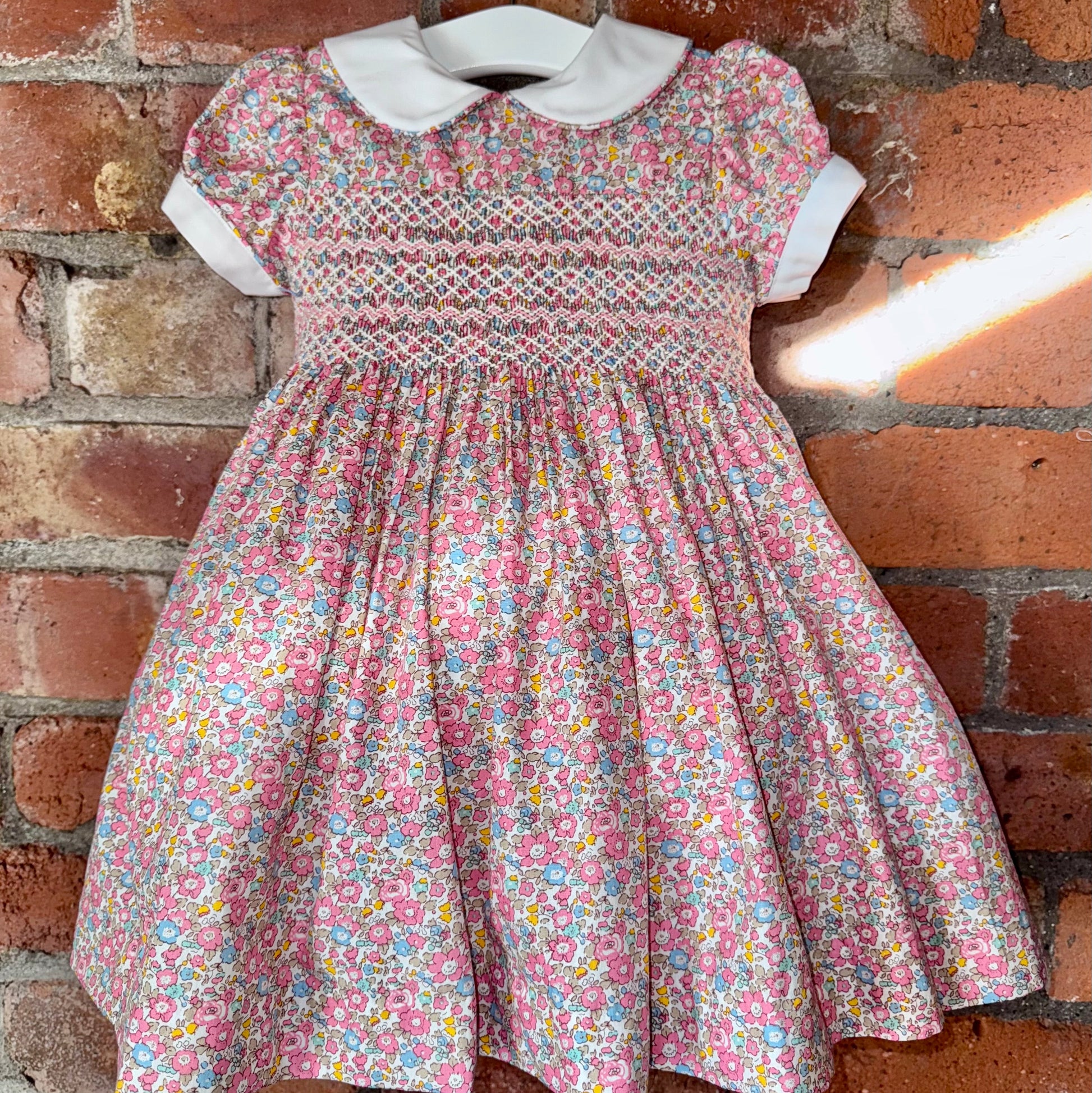 In beautiful floral with crisp white cotton collar and cuffs. Hand smocked front and back with a back waist tie.