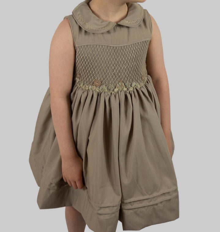Presenting our beautiful hand smocked FLORENCE dress in soft tan cotton.