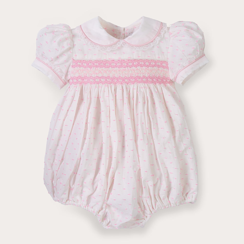 Presenting our beautiful hand smocked romper in white with pink Swiss dot.