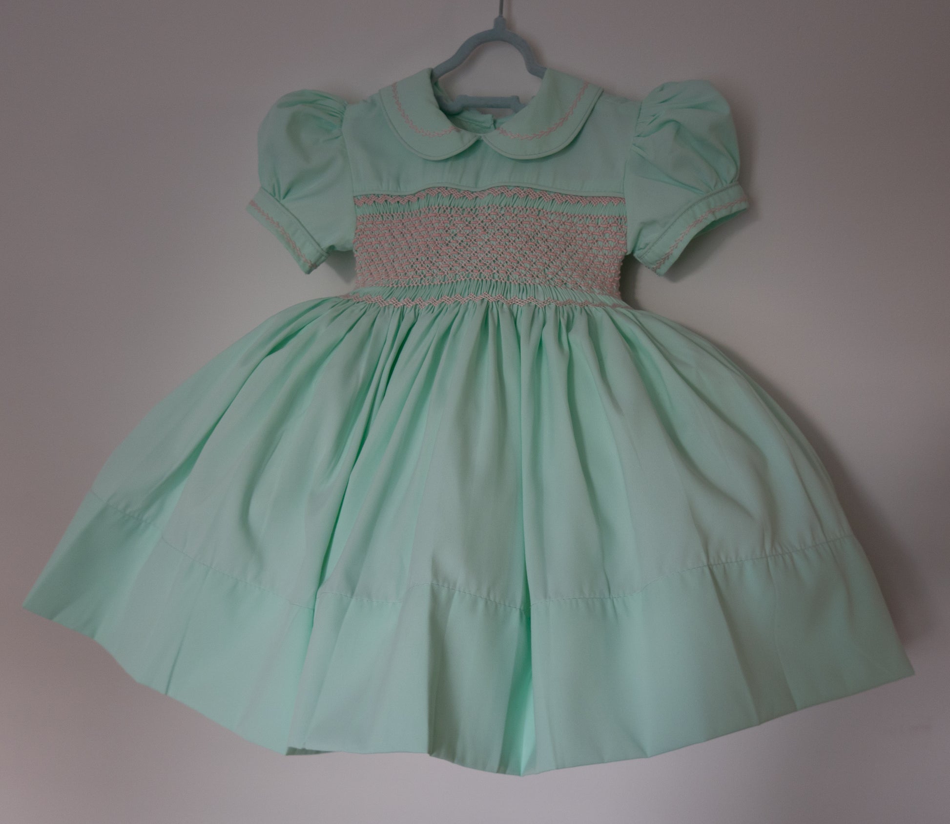 Presenting our beautiful hand smocked Millie dress in soft peppermint green.