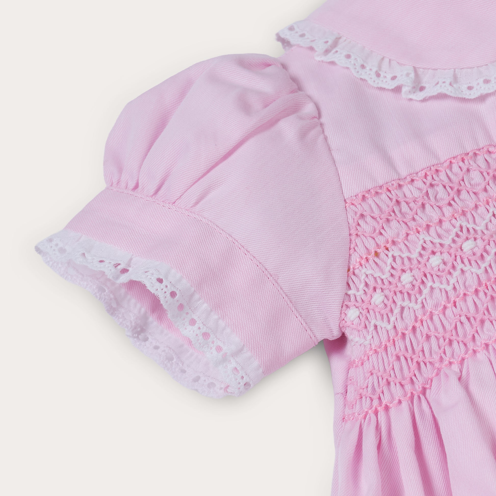 Beautifully crafted from soft pink cotton, the bodice features delicate hand smocking, carefully stitched by hand to create the traditional texture and heirloom character that defines classic children’s clothing. A softly gathered silhouette, puff sleeves, and a charming Peter Pan collar finished with delicate lace trim complete this elegant design.