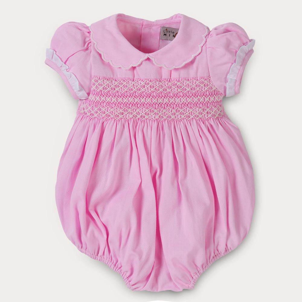 • Soft candy pink cotton with intricate hand-smocking across the chest
