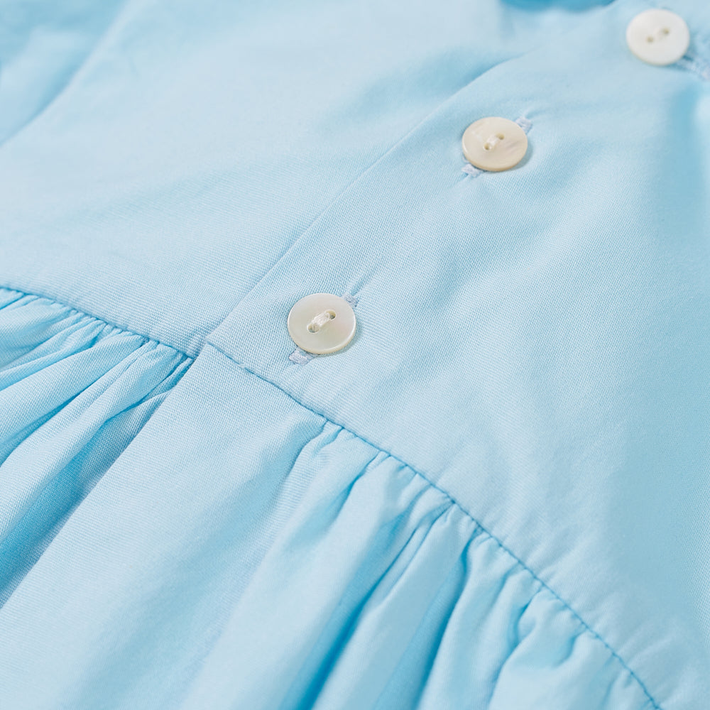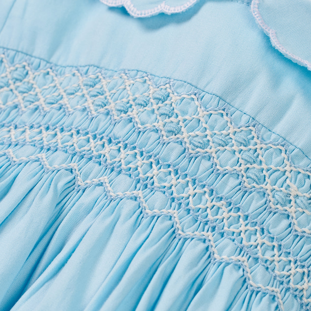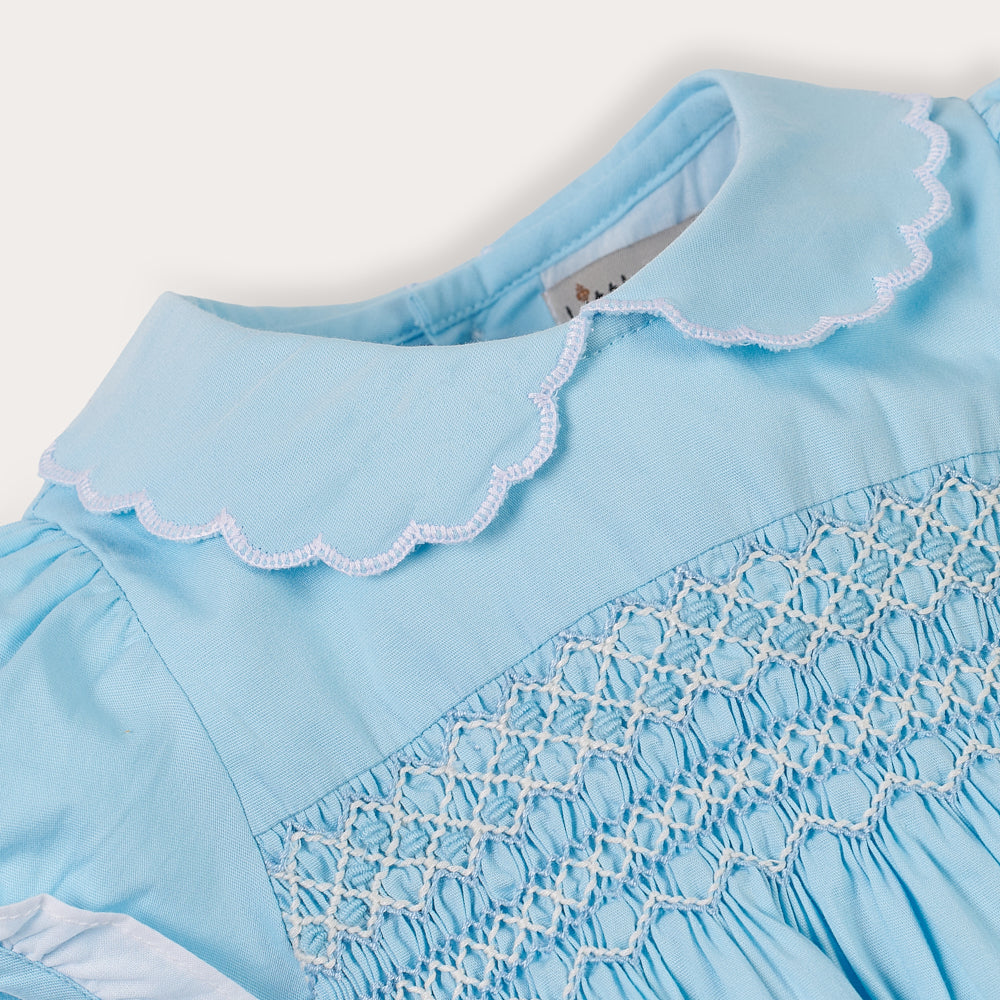 • Soft powder blue cotton with intricate hand-smocking across the chest