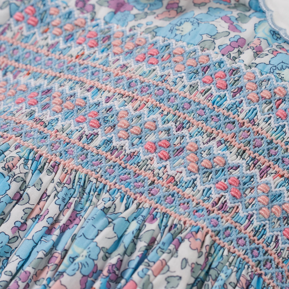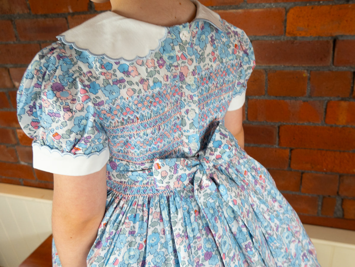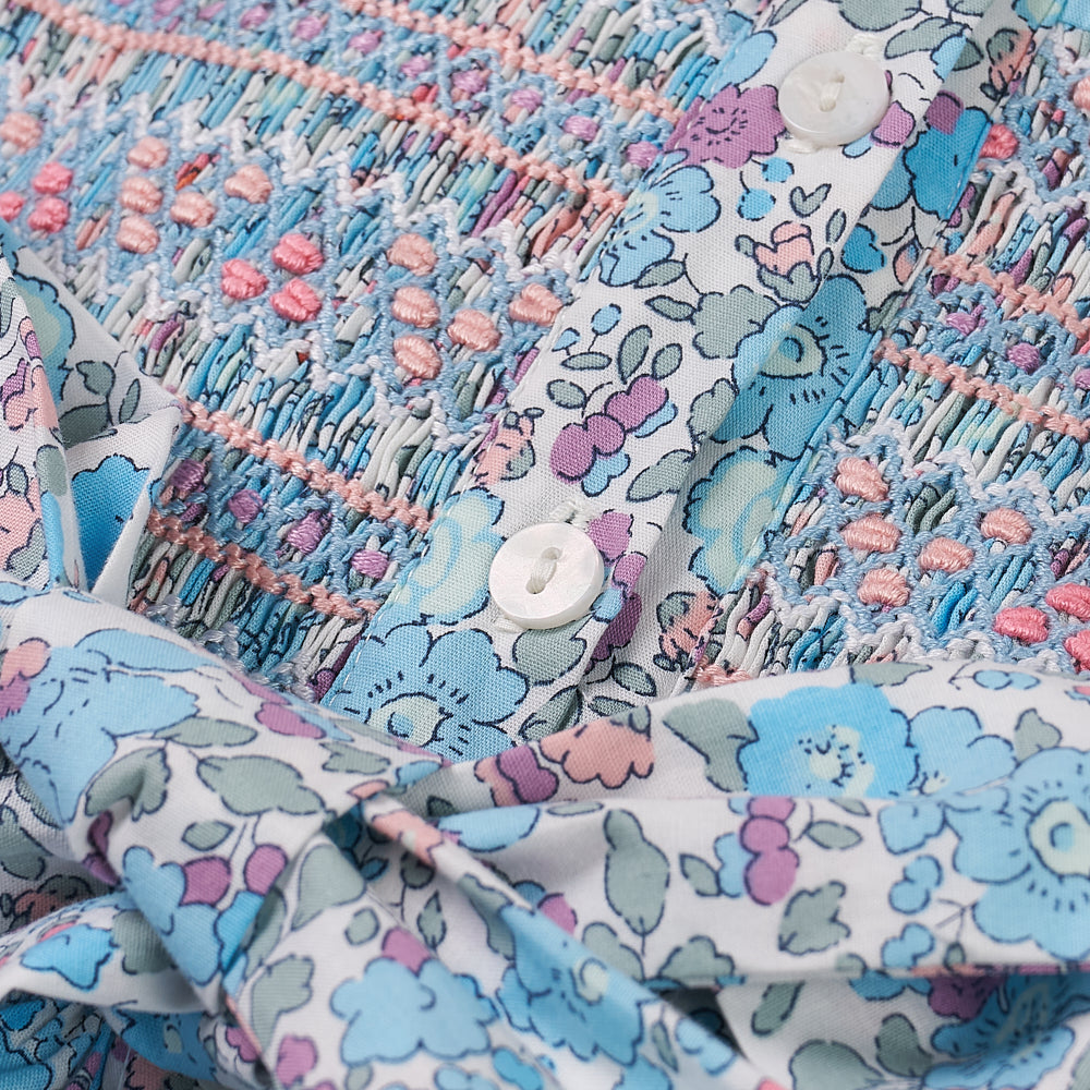 A dress worthy of the memory books. The Willow Dress is a true heirloom piece, exquisitely hand-smocked across the front and back in delicate pastel threads. Crafted in a fine floral cotton inspired by Liberty prints, every detail—from the puffed sleeves to the crisp white peter pan collar—has been thoughtfully designed for timeless elegance.