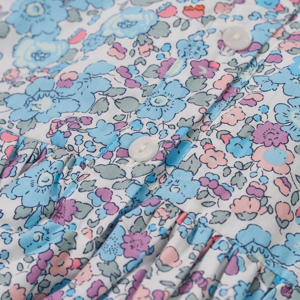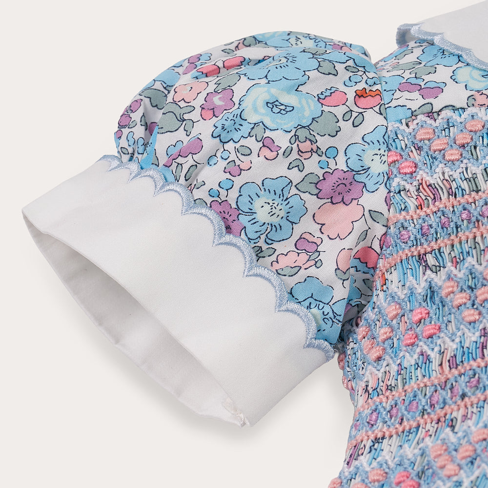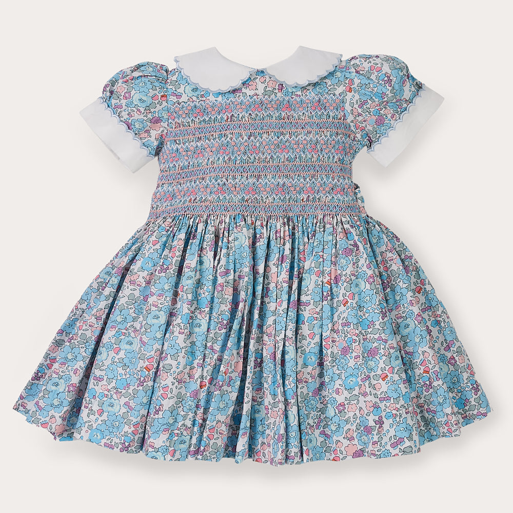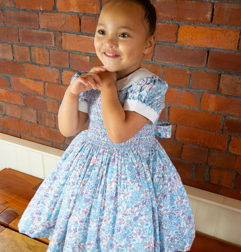 A dress worthy of the memory books. The Willow Dress is a true heirloom piece, exquisitely hand-smocked across the front and back in delicate pastel threads. Crafted in a fine floral cotton inspired by Liberty prints, every detail—from the puffed sleeves to the crisp white peter pan collar—has been thoughtfully designed for timeless elegance.