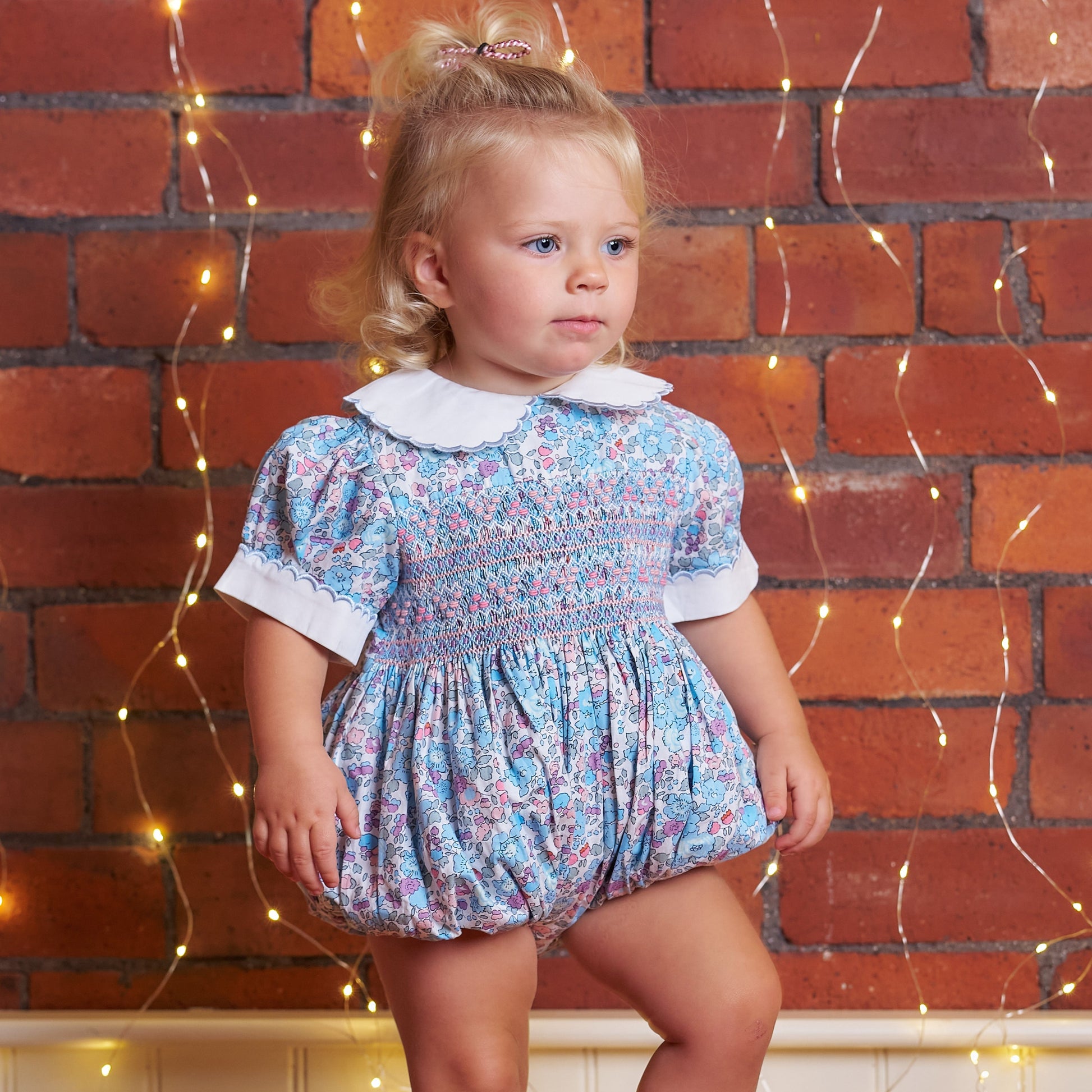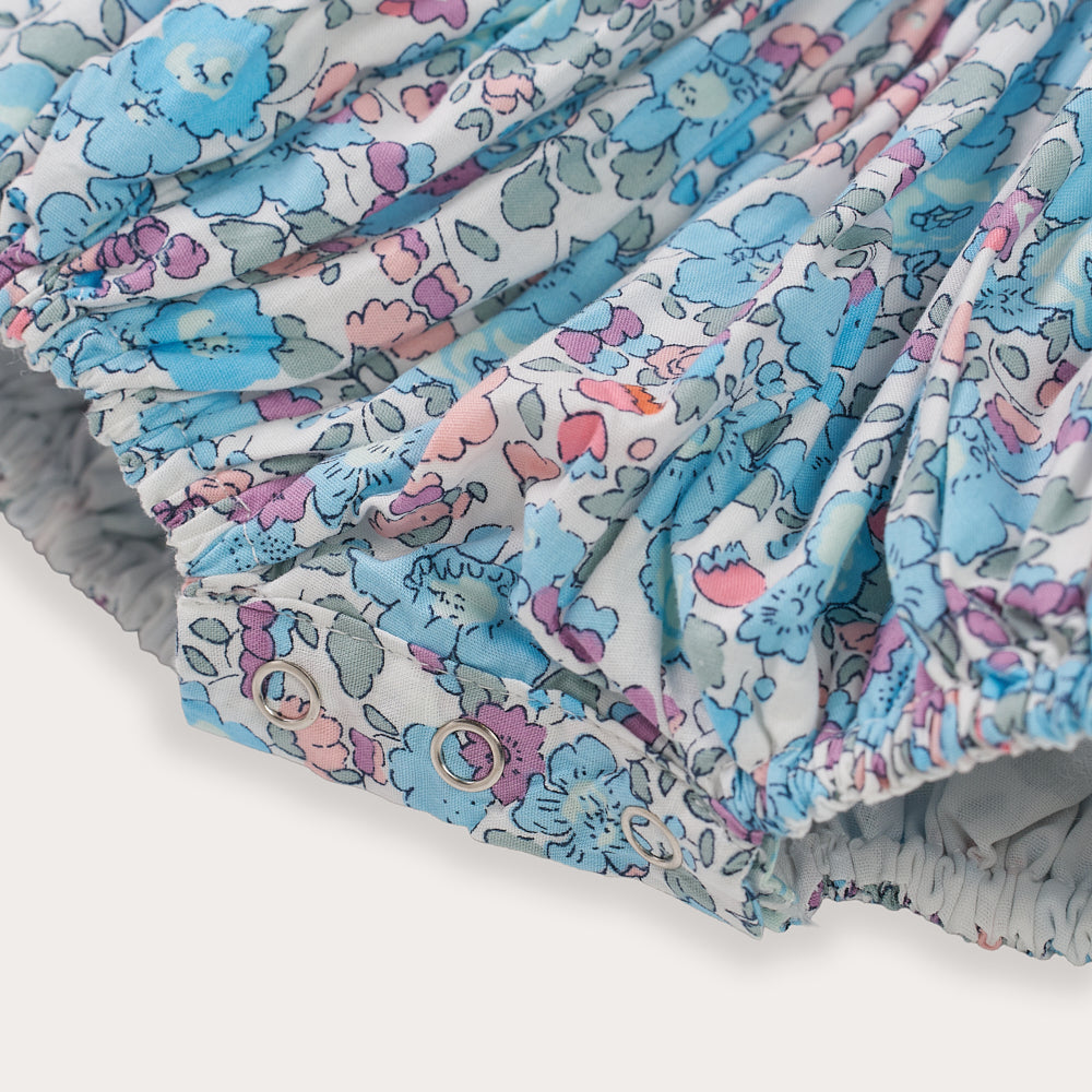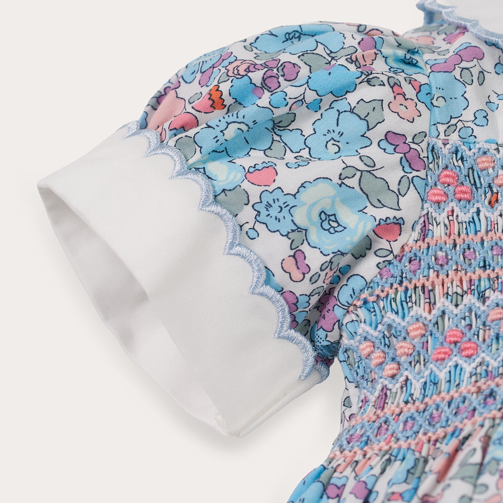 Hand-smocked front and back in soft pastel threads, it features delicate puff sleeves, scalloped peter pan collar, and a gathered bloom silhouette that’s as timeless as it is practical. The signature floral cotton is lightweight, breathable, and made for memory-making moments.