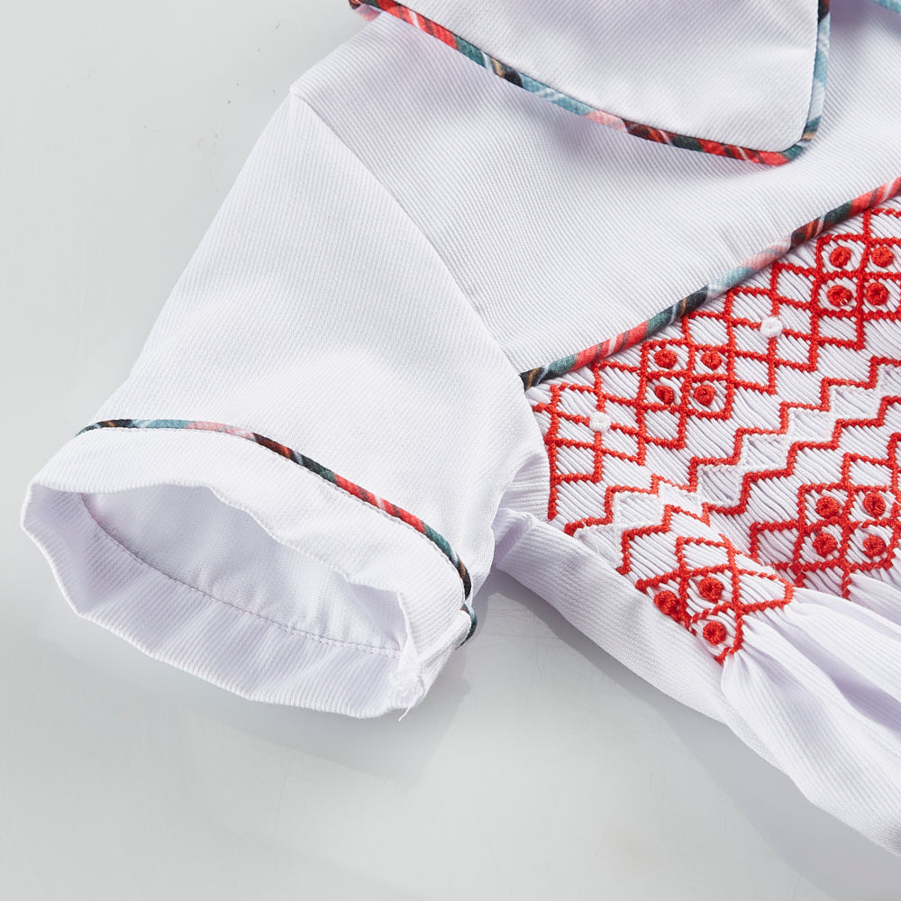 Exquisite hand smocking in red and white with pleated shorts. 100% premium cotton.