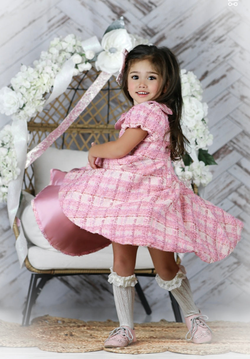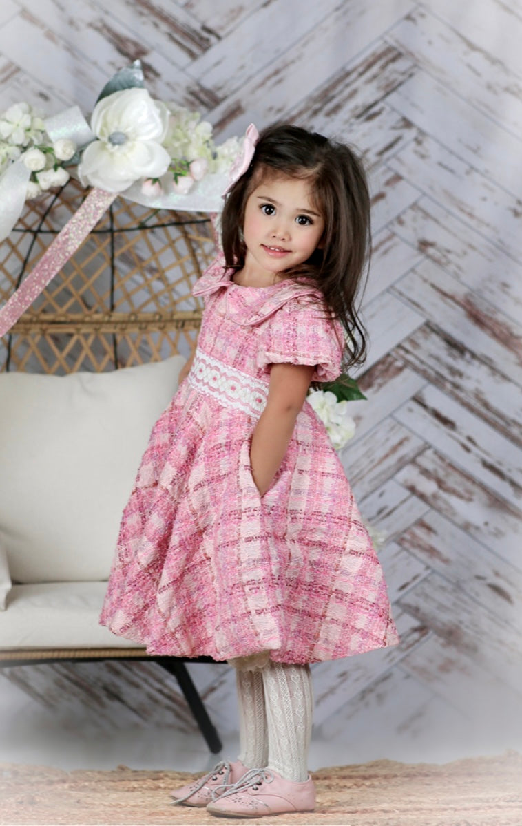 Such a thoroughly modern dress in the most glorious tweed in shades of pink.