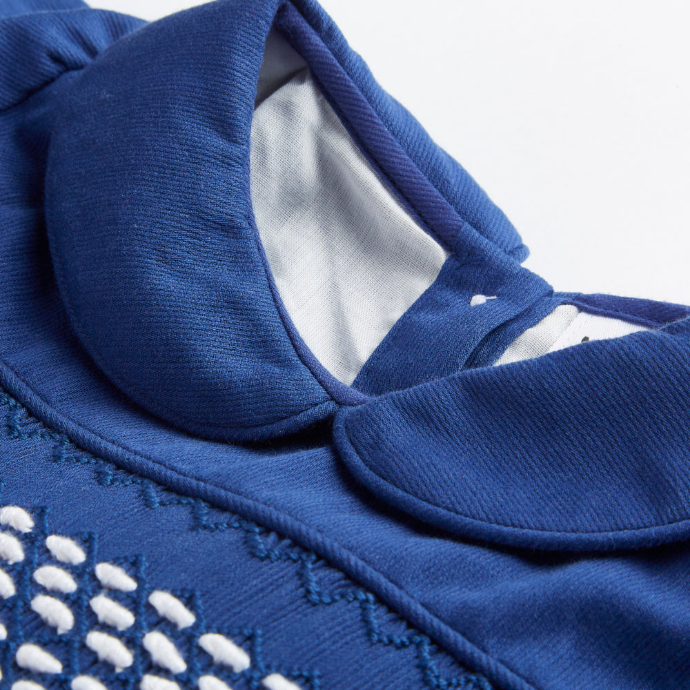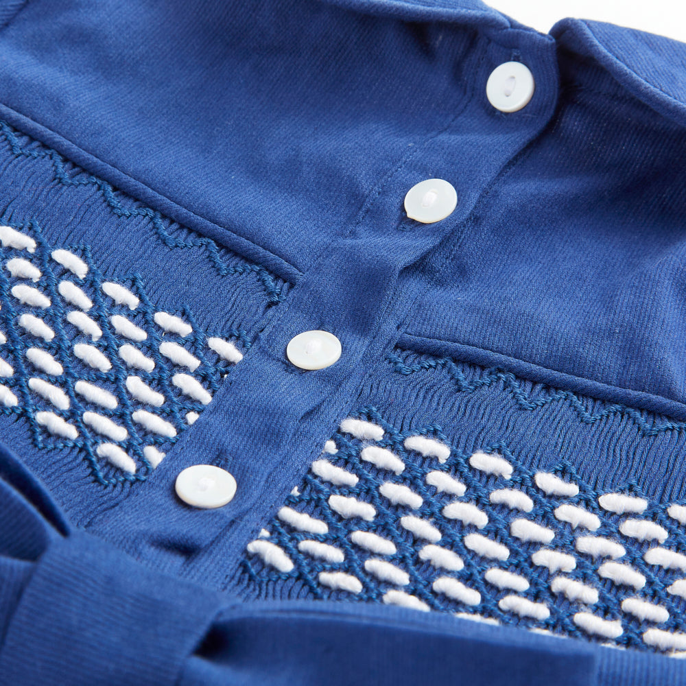 In 100% fine pique NAVY cotton. Slightly thicker than standard cotton which gives our beautiful NOELLE dress more structure and elegance perfect for the festive season. Very intricate smocking in navy and white thread.
