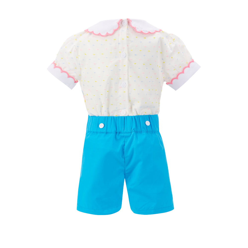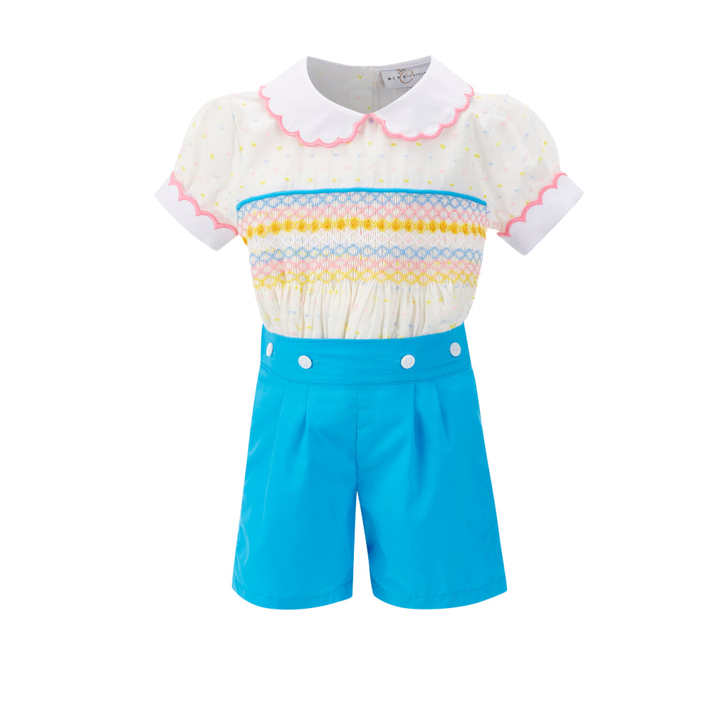Super cute hand smocked set. Exquisite hand smocking with pleated shorts. 100% premium cotton.