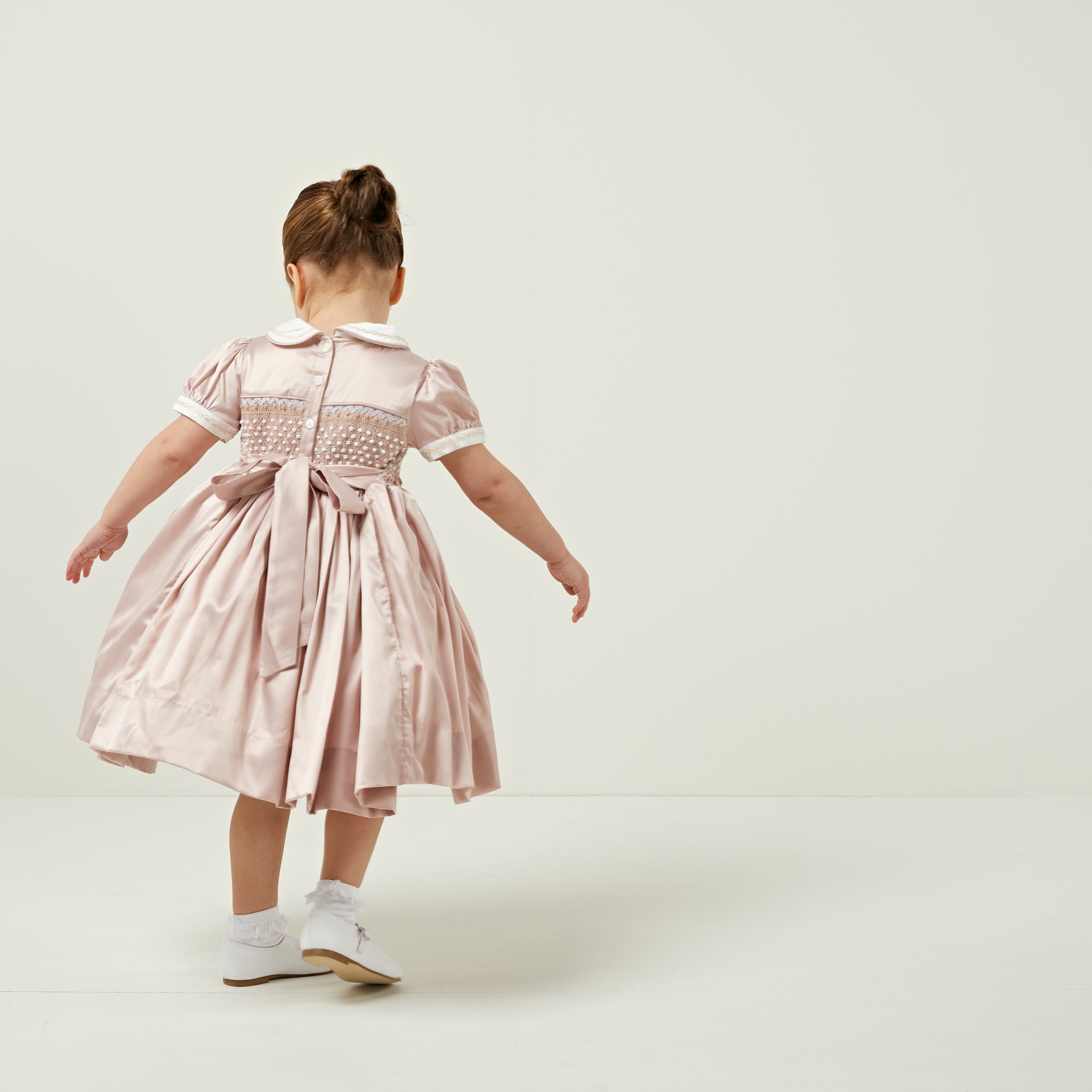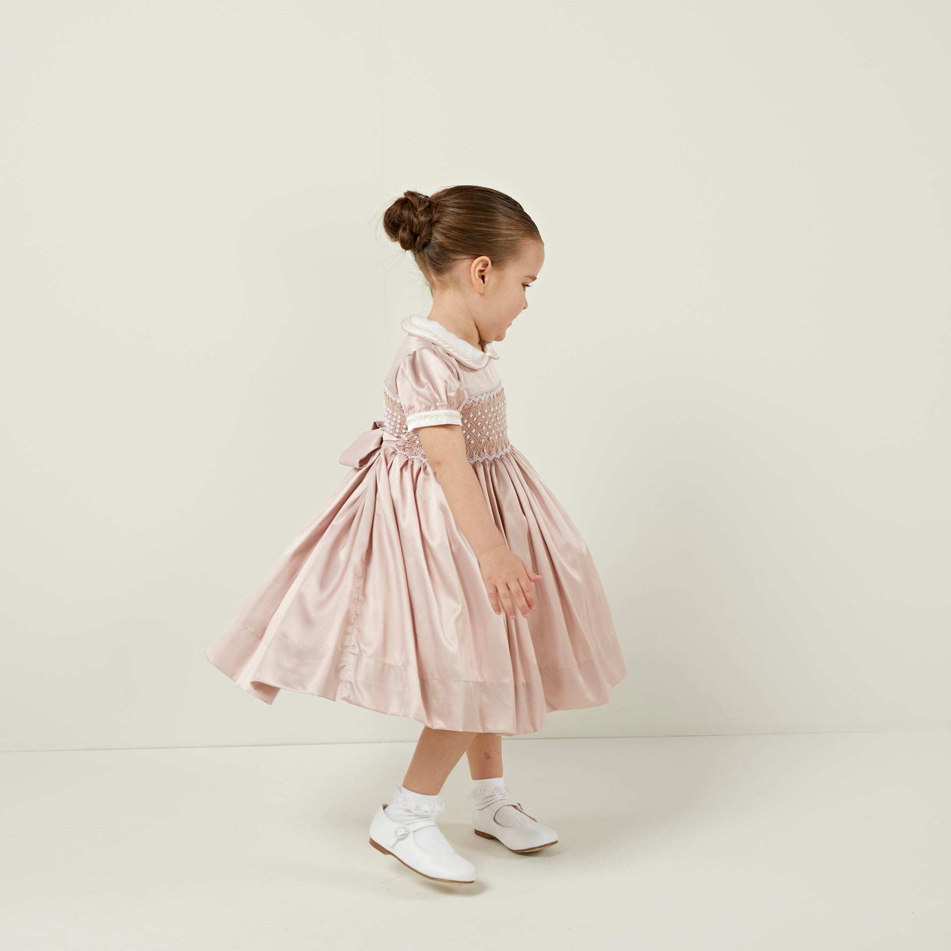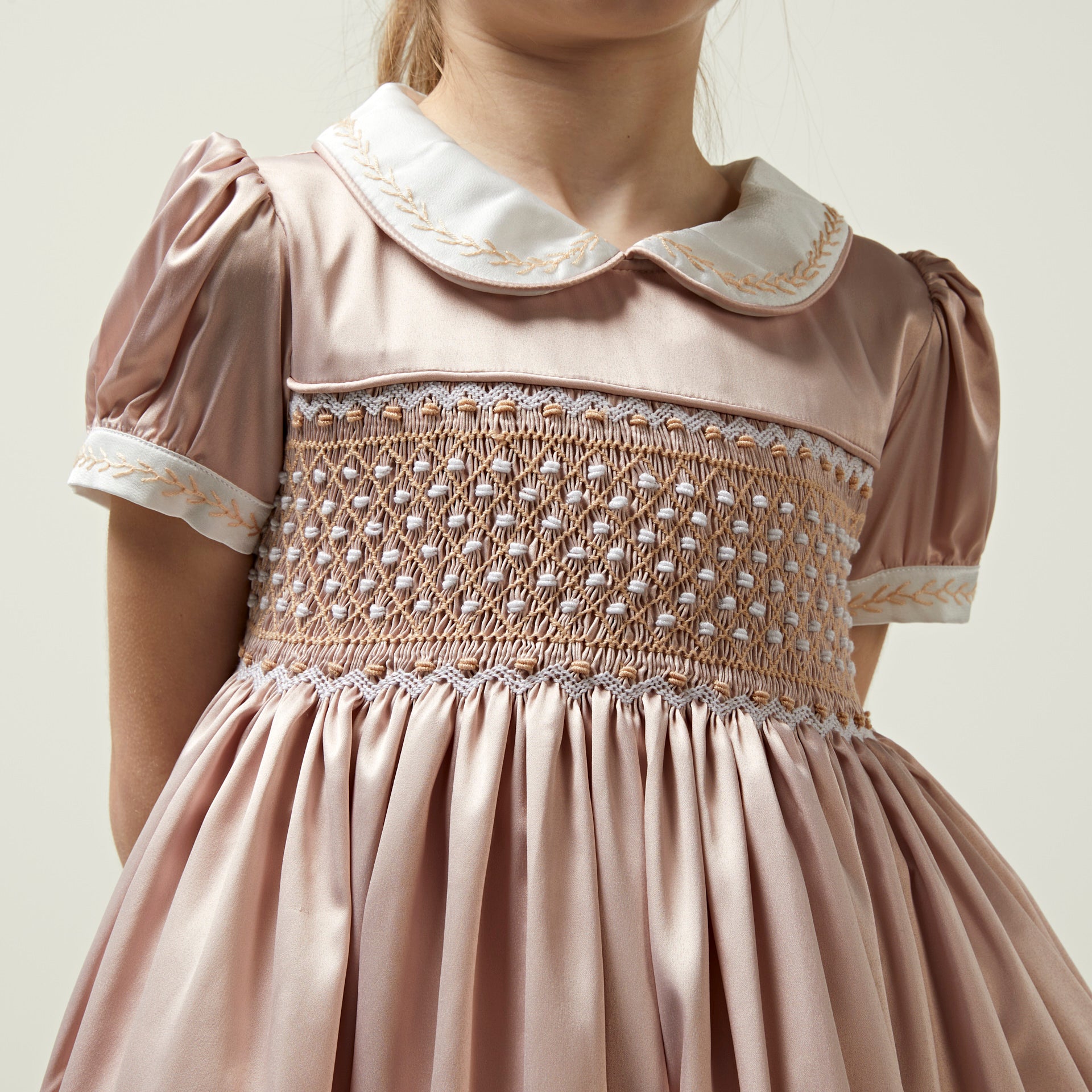 Presenting our beautiful hand smocked ROSAURA dress in the most beautiful rose gold satin shade.