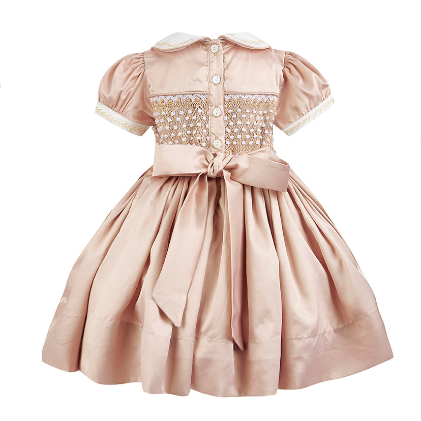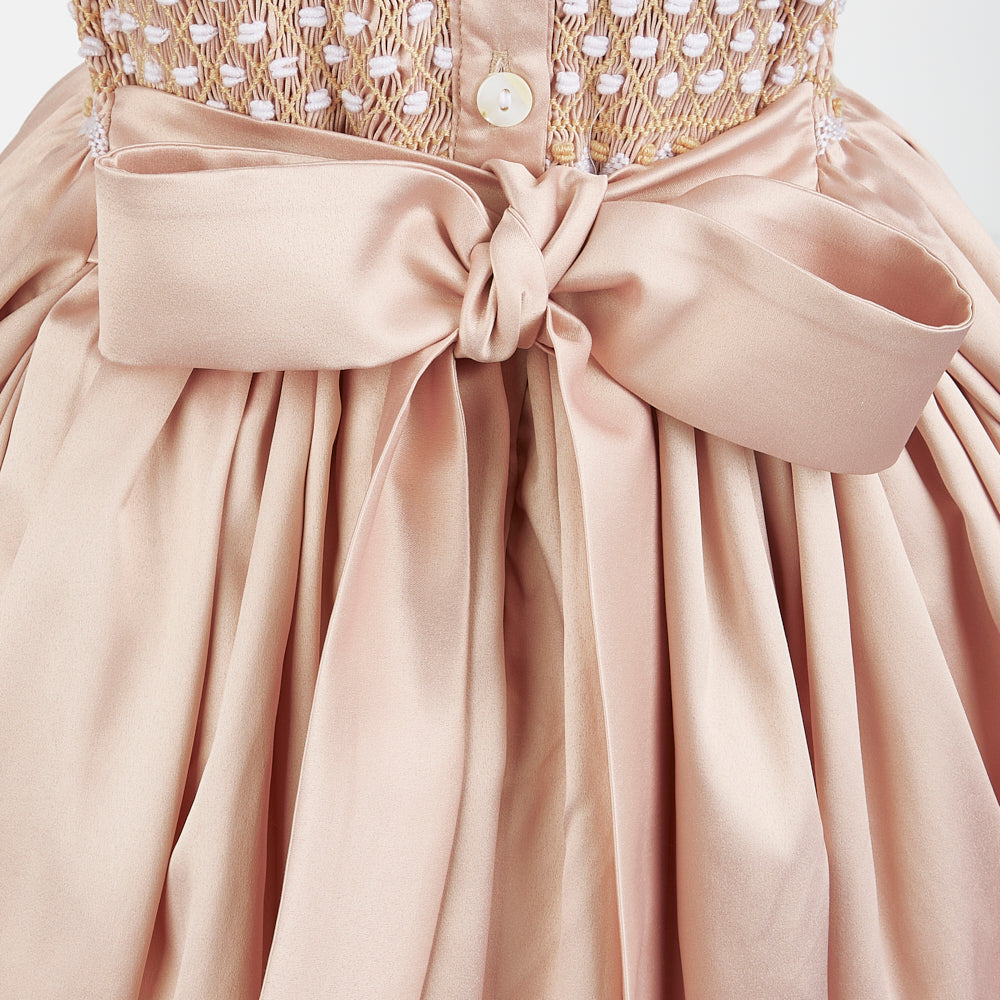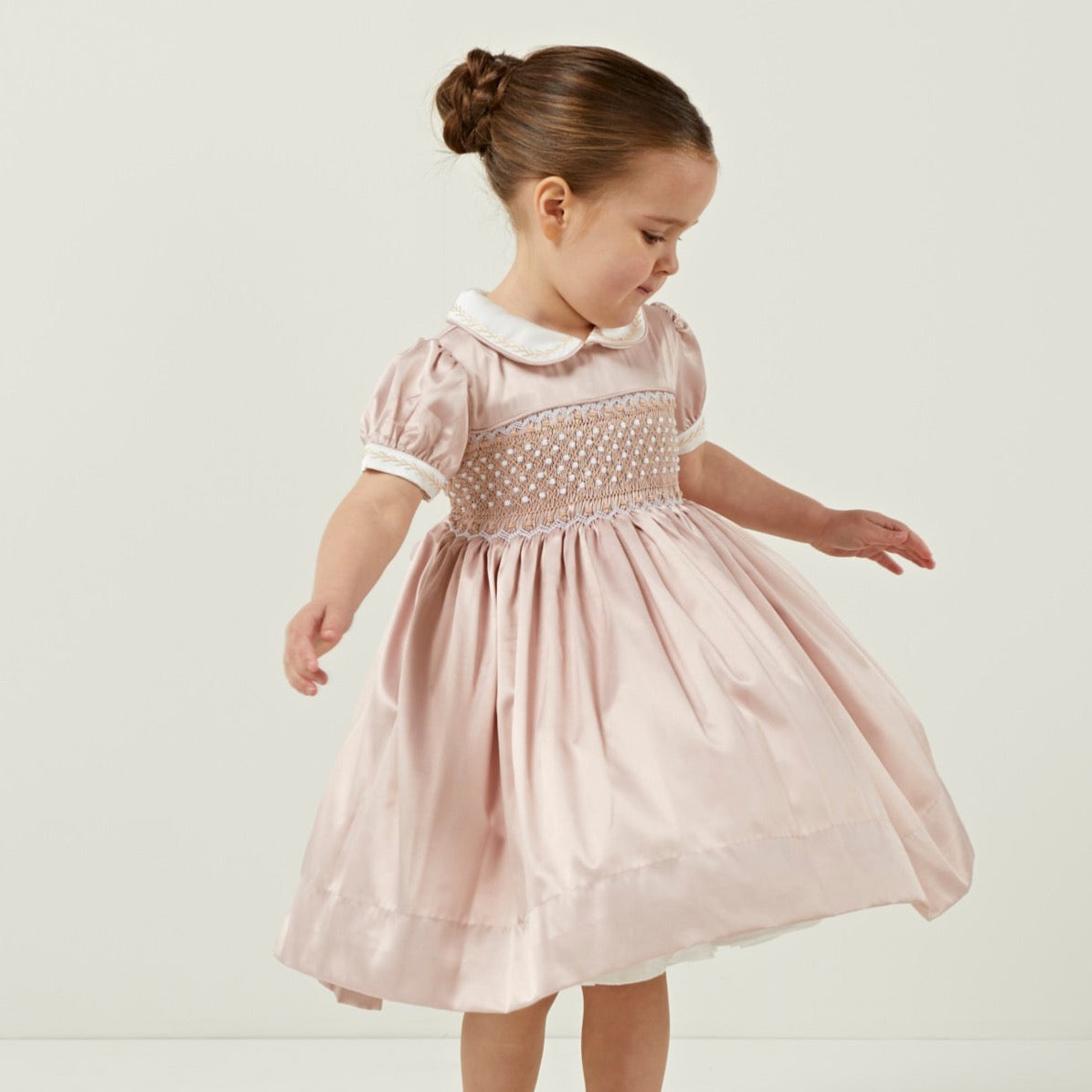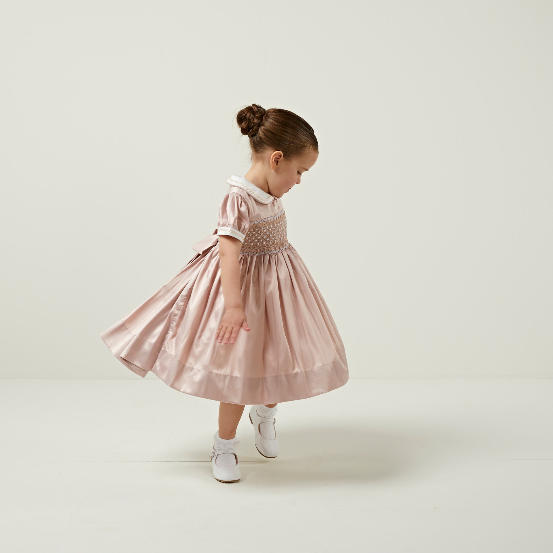 Presenting our beautiful hand smocked ROSAURA dress in the most beautiful rose gold satin shade.