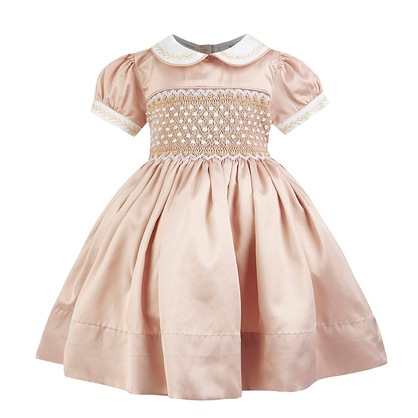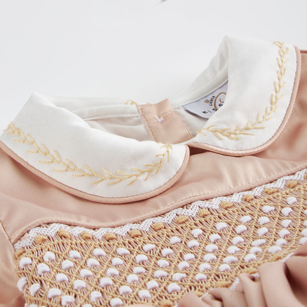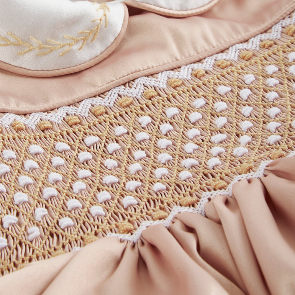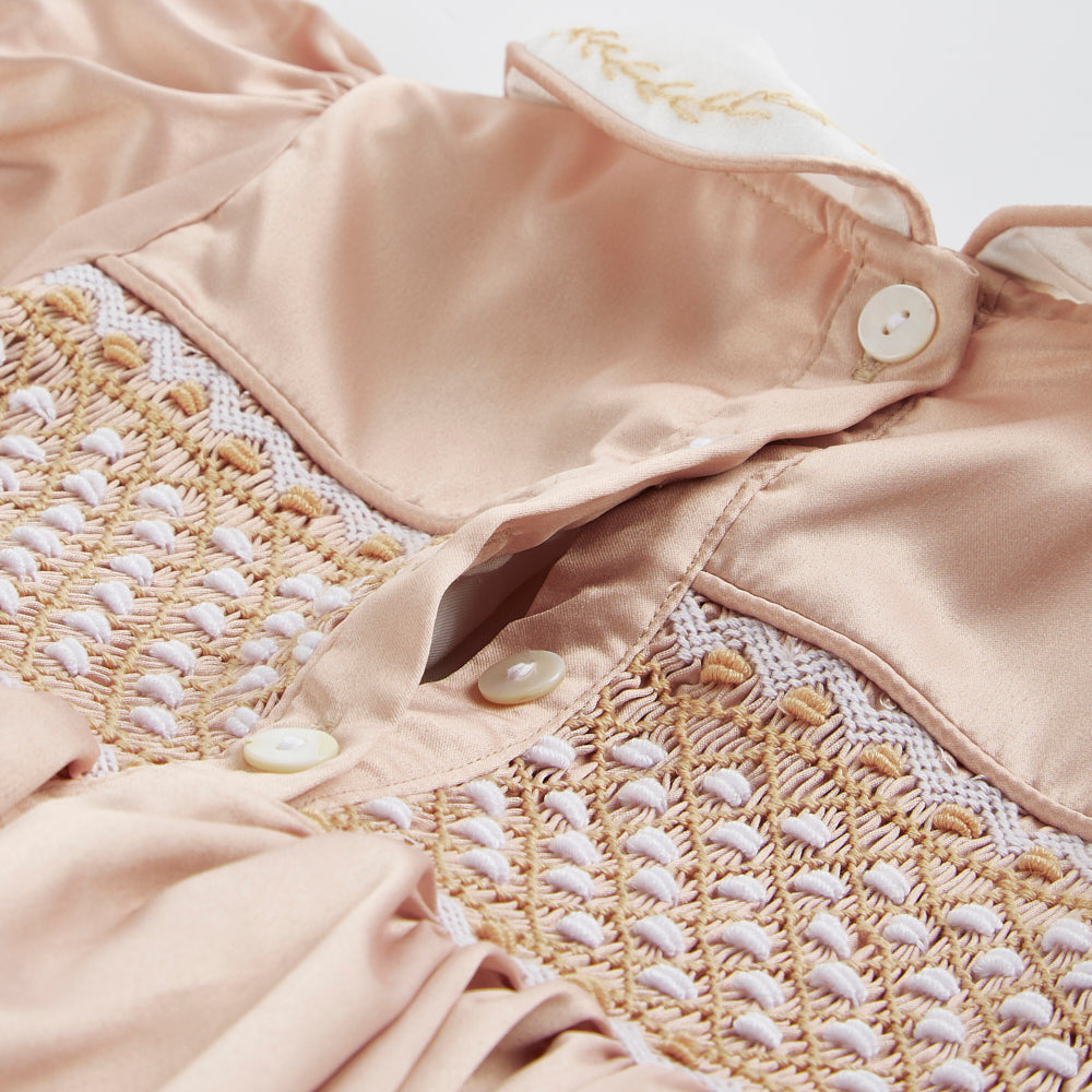 Intricate smocking in shades of rose gold and cream to compliment this stunning fabric.