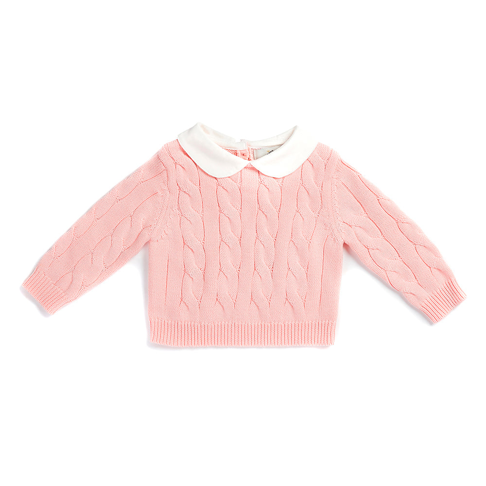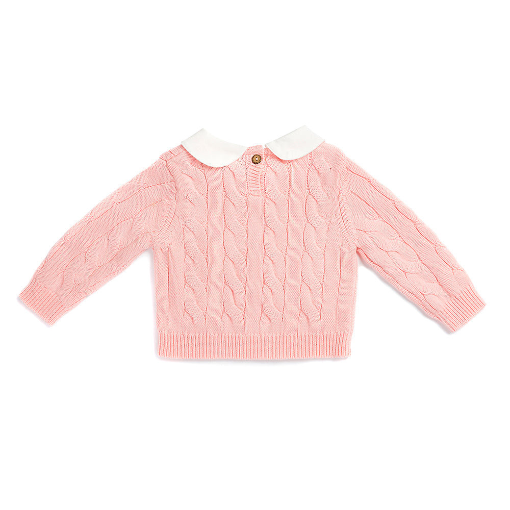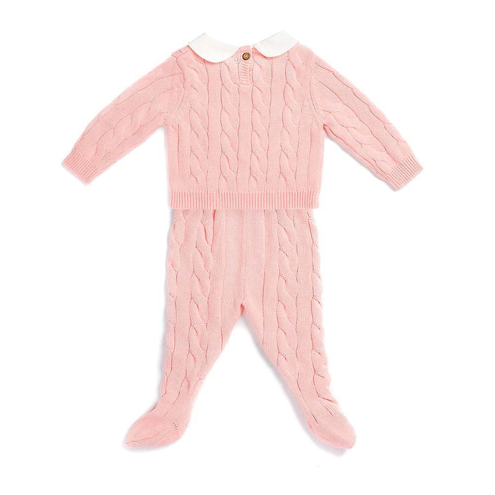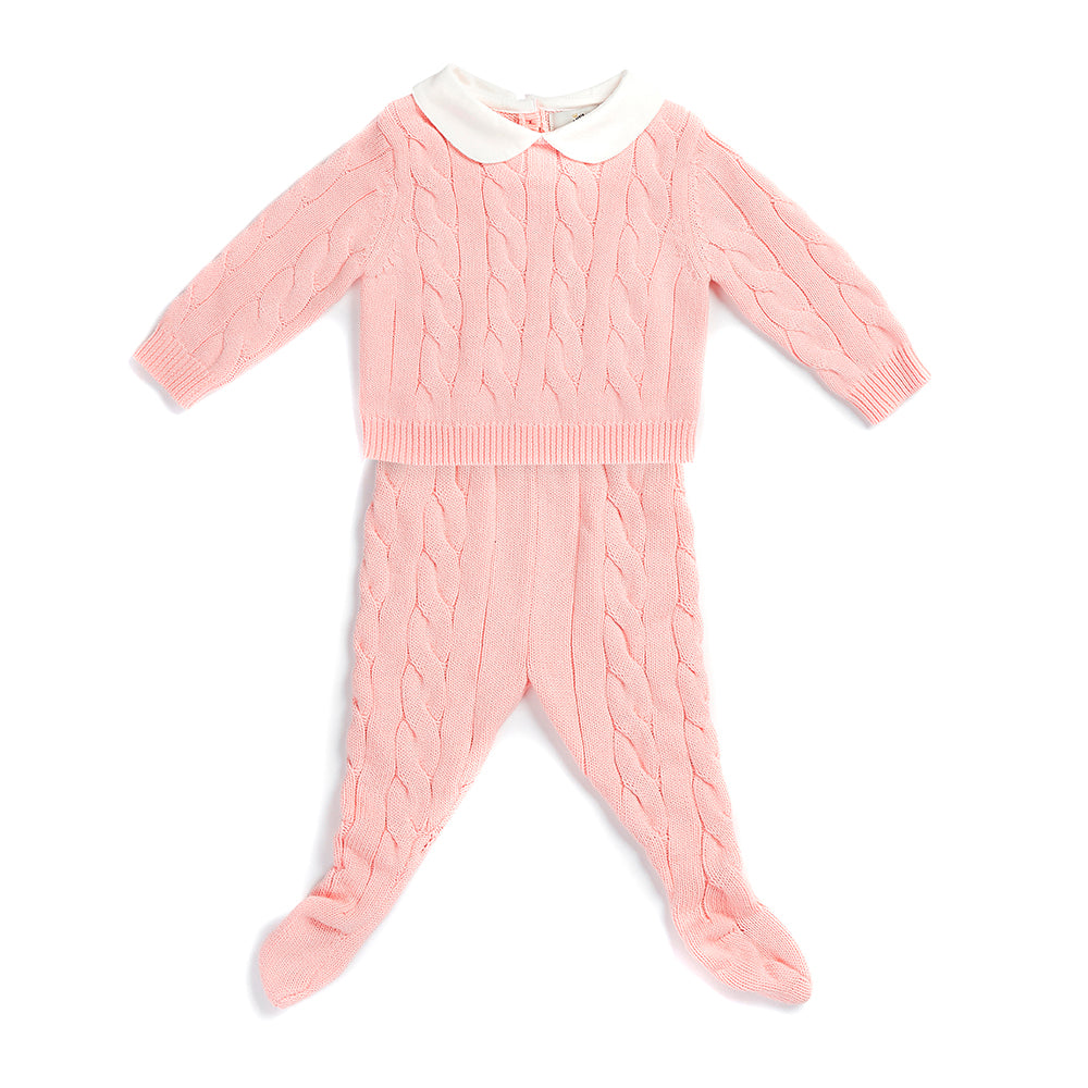 100% organic cotton. Fine cable knit. Enclosed legging. Long sleeved top with crisp white cotton collar. Super soft for the most delicate skin.