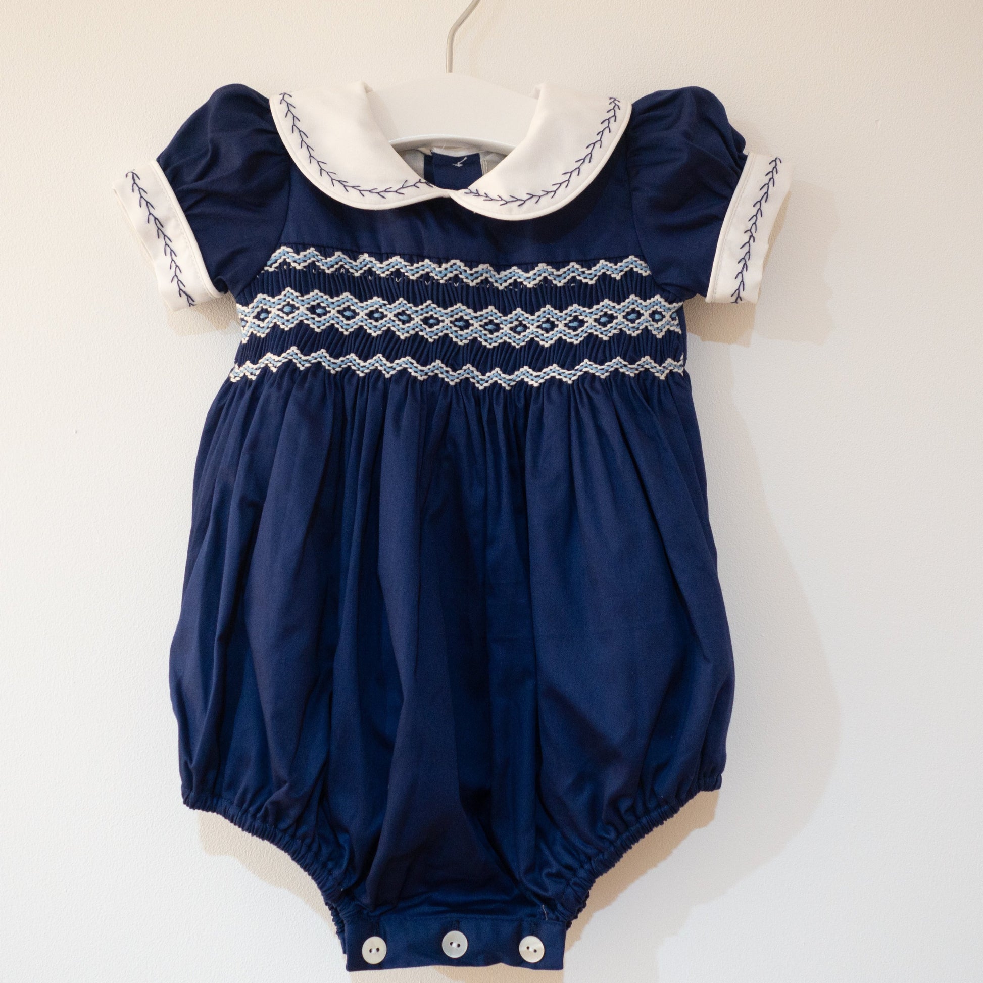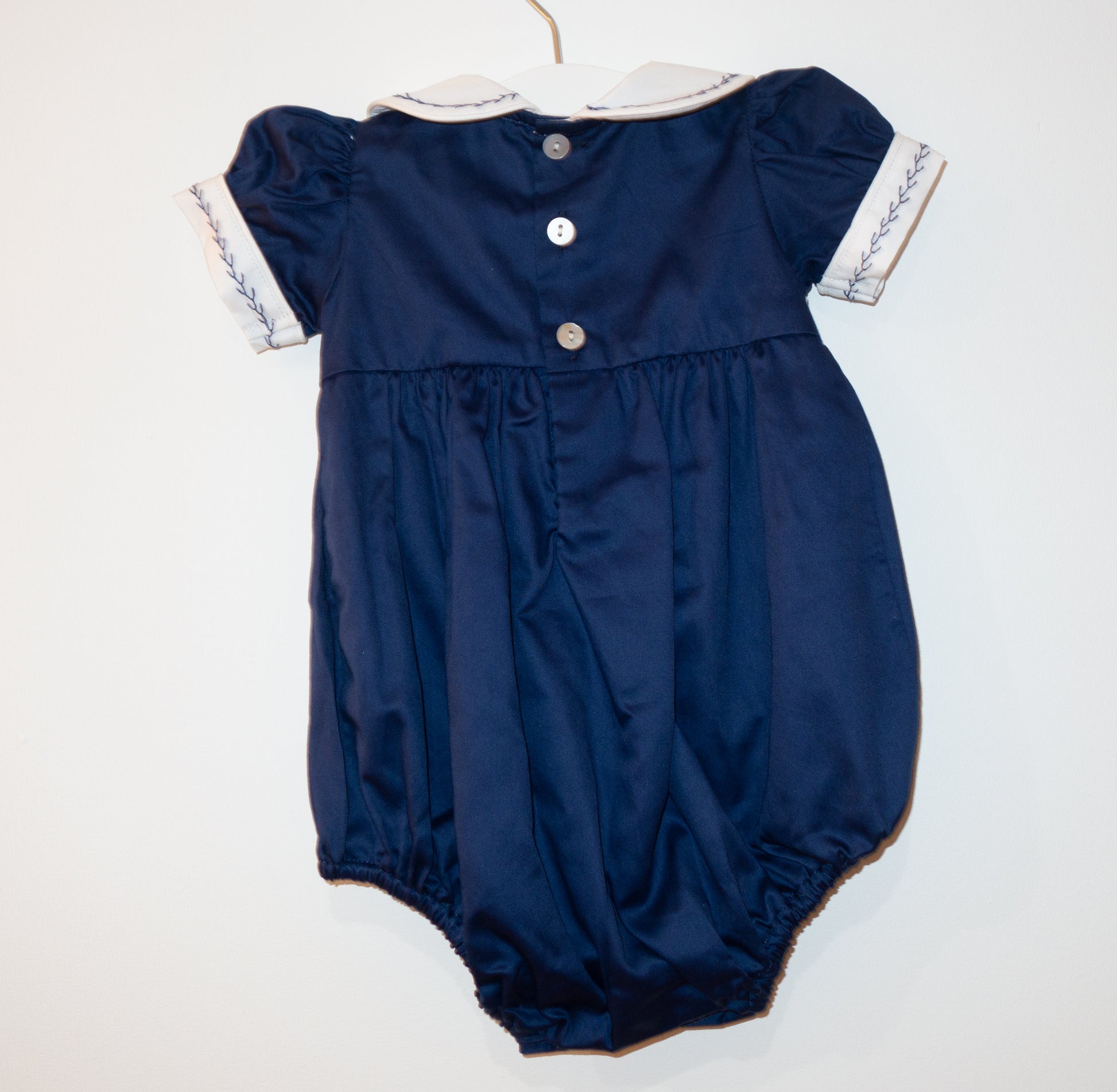 Presenting our beautiful hand smocked romper in the most beautiful navy blue  cotton satin.