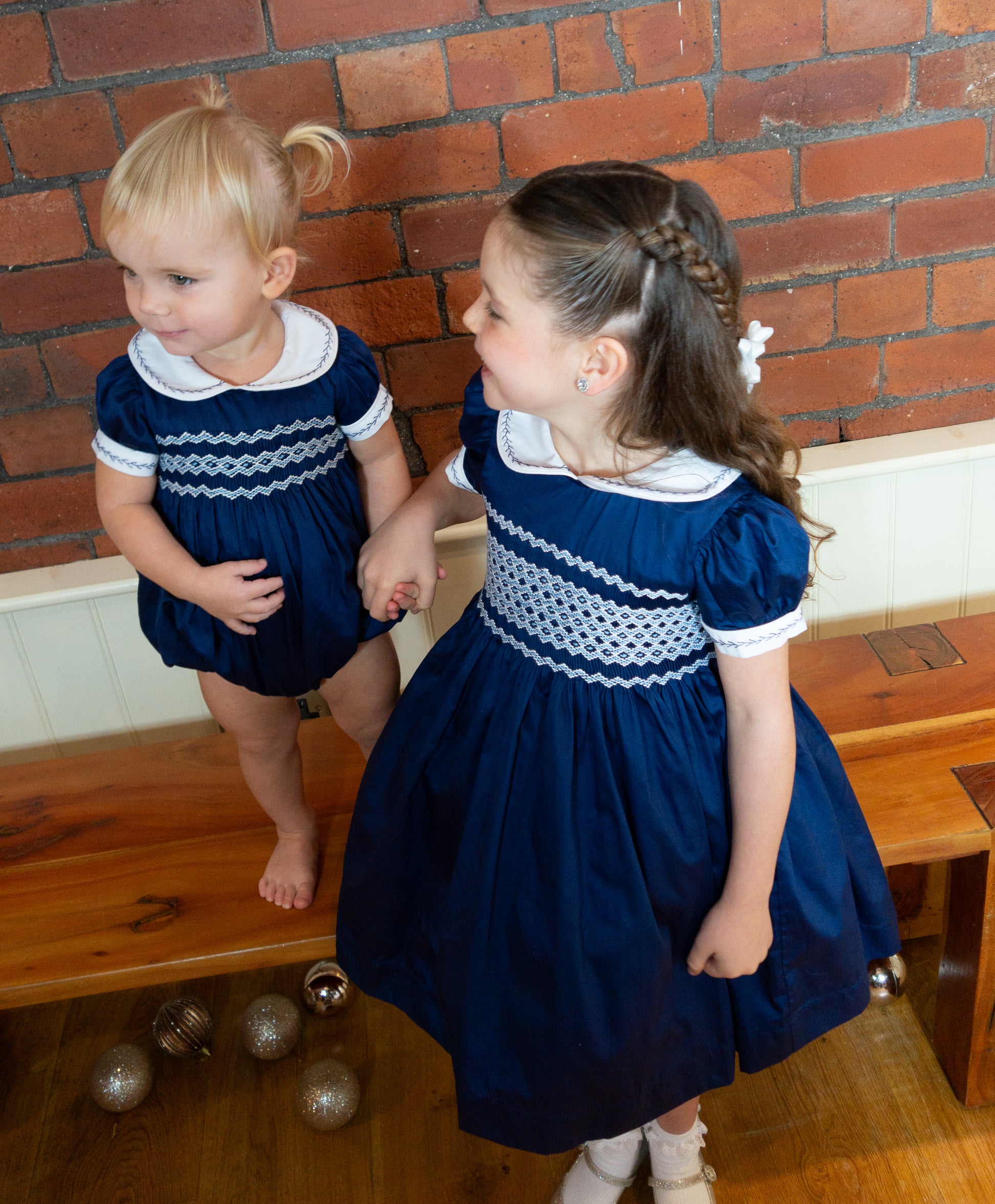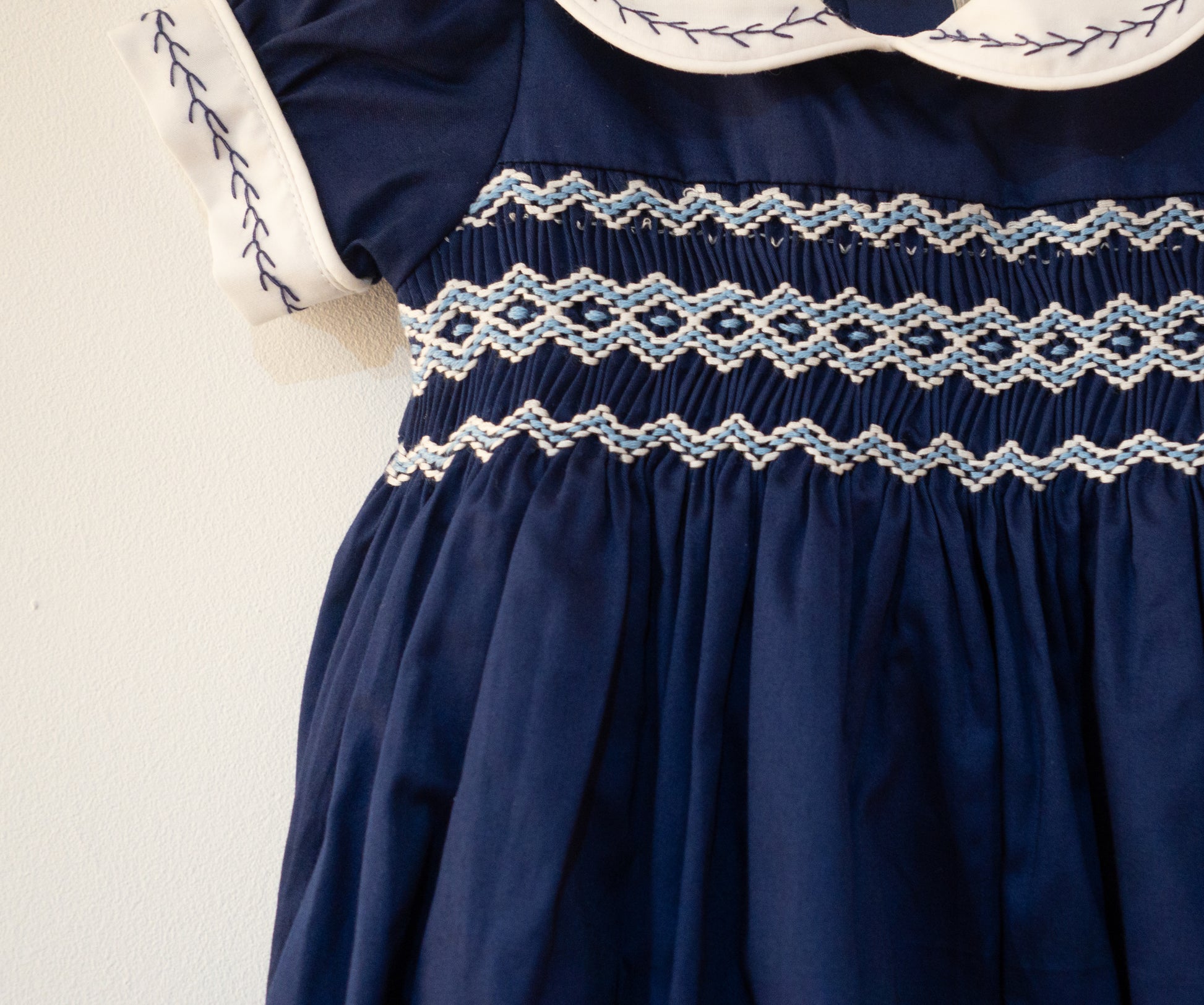 Intricate smocking in shades of navy and soft blue to compliment this stunning fabric.