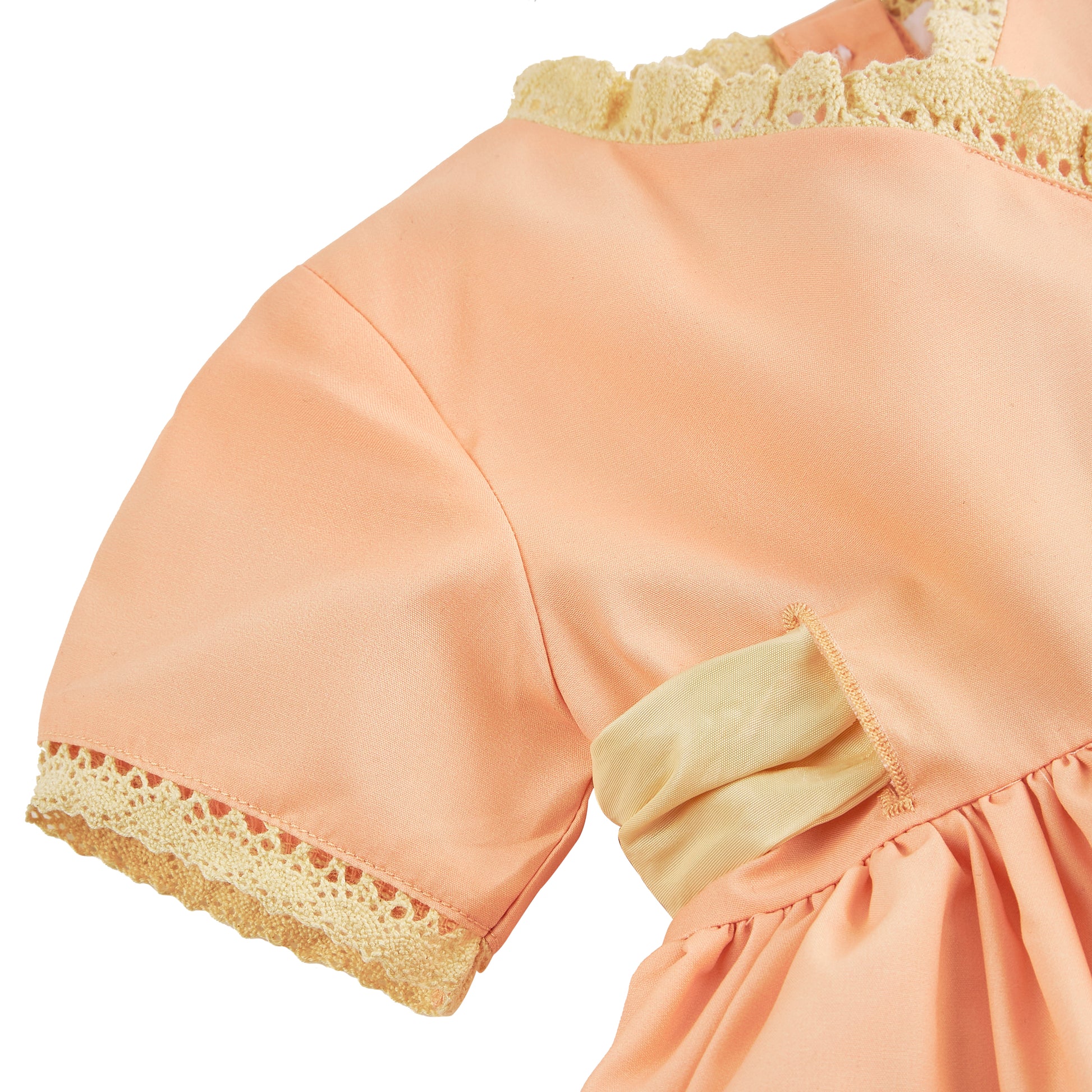 We are so in love with this stunning dress! Pale peach cotton with a soft gold lace trim.  Removable waist tie.