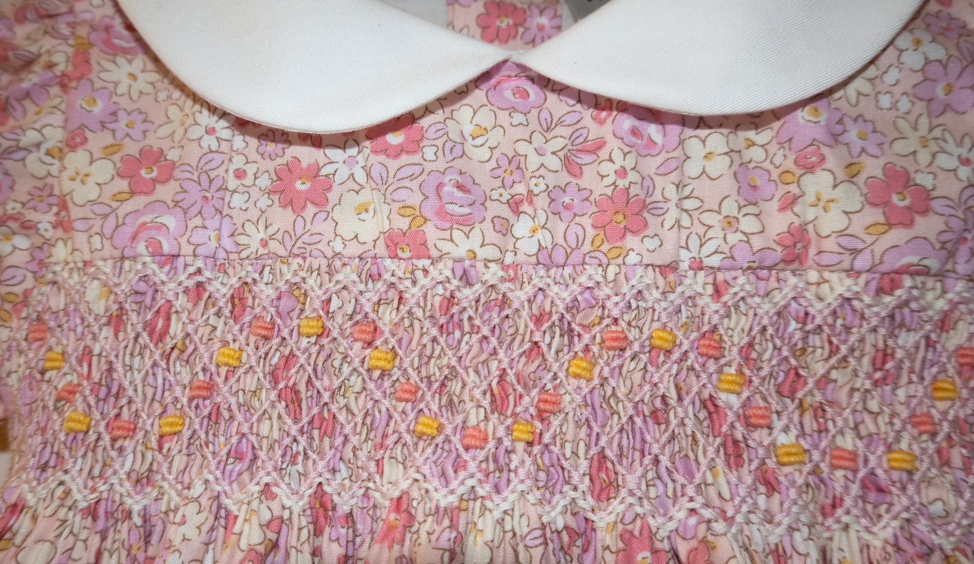 Hand smocked with a gorgeous soft flower pattern. Button through back with waist tie. Soft cotton lining.